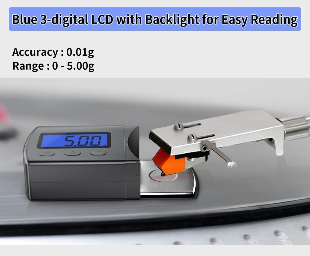 High Precise Digital Mini Turntable Stylus Force Scale Gauge 0.01g/5.00g Blue LCD Backlight for Tonearm Phono Cartridge. High precision and accurate, Precision: ±0.01g. Capacity: 0-5.00g. With Tare function, automatic calibration weight and turn-off. Comes with one calibration weight and two button batteries. *High Precision Stylus Gauge Accurate to 0.01g for Perfect Stylus Force Adjustment *A Good Helper for Optimal Record Playback, Helps Prolong the Life of the Cartridge *With Tare Function, Automatic Calibration Weight and Turn-off *Suitable for MM/MC/MI Cartridge, Nonmagnetic, No Magnetic Field Adhesivity, Reliable Readout Capacity *Blue Backlight Display for Easy Reading, Superior Leather Sheath Pack for Good Protection, Comes with One Weight and Two Button Batteries Enable to Longtime Standby.