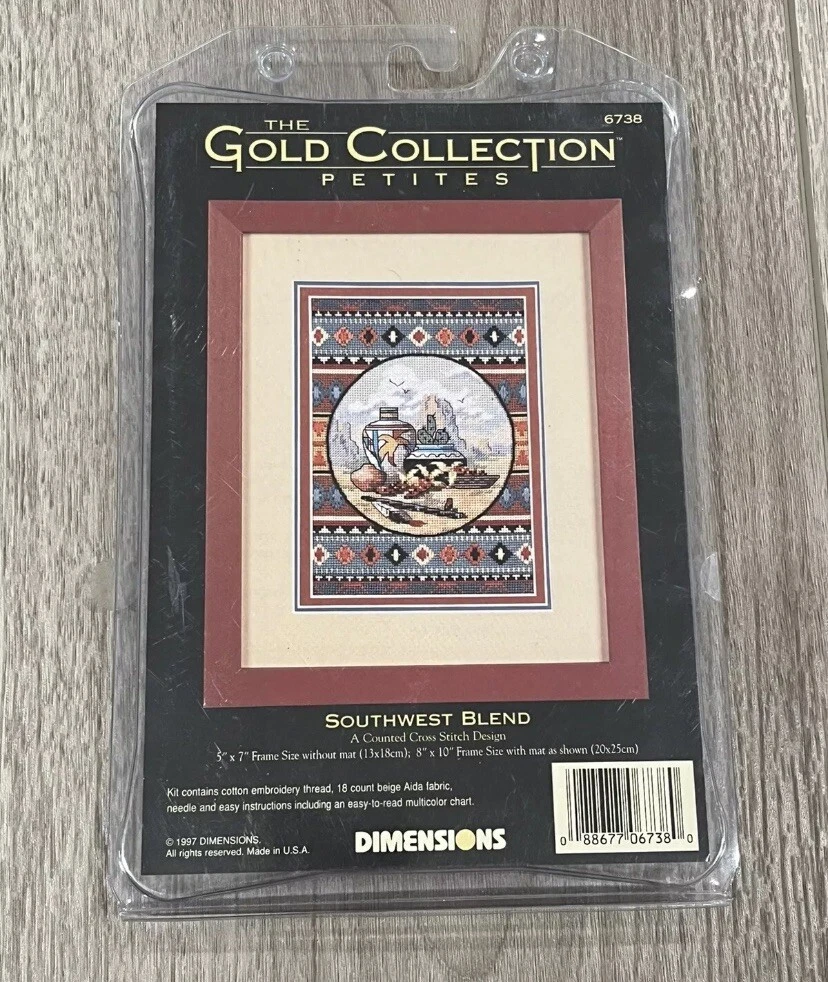 The Dimensions Gold Collection Petites Southwest Blend 6738 Counted Cross Stitch Kit features a design with a Southwest theme, ideal for craft enthusiasts. The kit includes pre-sorted thread, a needle, instructions, and fabric/cloth for creating a framed picture. Made in the United States, this kit is part of the Dimensions Gold Collection, known for high-quality cross stitch projects. Perfect for those who enjoy intricate stitching and Southwest-inspired decor, this kit offers a creative and rewarding crafting experience.