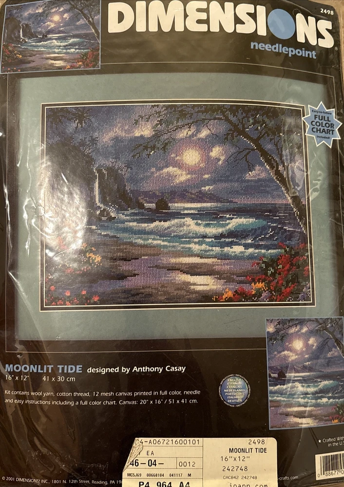 Dimensions Needlepoint MOONLIT TIDE #2498 New SEALED 16" x 12" Kit Cross stitch The Dimensions Needlepoint Moonlit Tide kit features a design capturing the essence of a beach and nautical theme. Made in the United States, this kit includes everything needed to create a 16" x 12" needlepoint artwork. The Moonlit Tide design is sealed and brand new, offering a creative and relaxing project for embroidery enthusiasts. To upcycle, I reuse shipping material as often as possible. Buy more from my store and save on shipping.