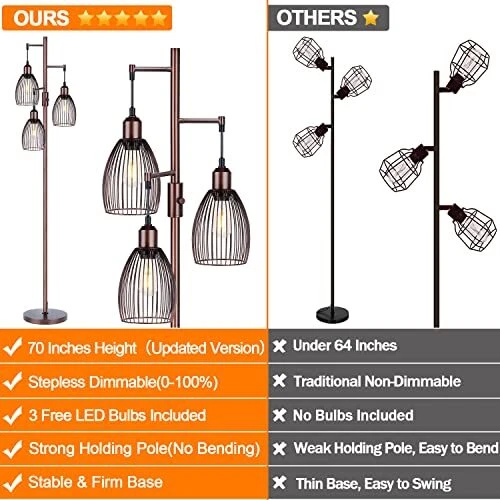 Return Policy Fast Delivery Trusted seller Dimmable Floor Lamp, 3 x 800LM LED Edison Bulbs Included, Farmhouse Industrial Floor Lamp Standing Lamp with Elegant Teardrop Cage Head Tall Lamp for Living Room Bedroom Office Dining Room - Brown Product Description ❤【70 Inches Floor Lamp】 70 inches height, this industrial floor Lamp with Metal Base diameter 9.8 inches. 6.17ft long power cord makes it easy to put your LED floor lamp anyw. The farmhouse floor lamp is specially built with a heavy, stable base and lamp pole to ensure it keep standing steadily even on the carpet. Strong holding pole, No Bending No Leaning. Sturdy Pole Heavy Base Stable & Firm. ❤【Updated Stepless Dimming( 0-100% ) Floor Lamp】Unlike the traditional non-dimmable floor lamps for living room, our dimmable floor lamp is fully Stepless Dimmable. Just simply twist it and then you can adjust the industrial floor lamp in the brightness range of 0 to 100% according to the needs of different scenes. Perfect for general indoor areas which including Dining room, Living Room, Bedrooms, Office, Kitchen, Corridor, Cafe, Basement, Bar, Club, Restaurant, Library and Reading Room. ❤【3 x 800 lumens LED Bulbs Included】Our floor lamps are designed with 3 E26 lamp holders. Compatible with a variety of normal E26 LED, CFL, incandescent and halogen bulbs etc(Dimmable Bulb Only). This set comes with an E26 base bulb, 25,000 hour bulb life, 6W(60W equivalent), 800 lumens, 2700K (warmwhite), No flicker or buzzing. 【Elegant Appearance】With design of the elegant, simple black metallic construction make the tall tree lamp well matched to styles of industrial, vintage and farmhouse furnitute. The special birdcage lampshade makes it ideal for multiple styles of decoration, such as minimalist, industrial and mid-century. The multi-head design cage shade lampshade brings soft warm light you need and adds decorative effect to your room. 【36 Months 】We proudly stand behind all of our products 100%, which is why we offer a full 36 months warranty. The package includes everything needed for assembly; no other tools needed for installation! If your lamp has any defect or stops working within 3 years, we help you troubleshoot or send a whole new product. ( If you have any problems with our standing lamp, please be sure to let us know and we will reach you at the soonest and help you) Shipping Returns Payment Shipping Shipping is FREE to all addresses other than APO/PO boxes in the lower 48 states. All our stock ships from US-based warehouses. Shipped via USPS or UPS (depending on location and package weight) Unless stated otherwise, all orders will ship within 24-72 hours of your payment being processed. Check our feedback to see the great reviews of FAST shipping we offer. Returns Seller does not accept returns Payment We currently accept payment via eBay managed payments only. Once payment is cleared, we will dispatch your shipment within 1-3 business days. Please refer to the "Shipping" tab for more information regarding shipping speed to your destination.