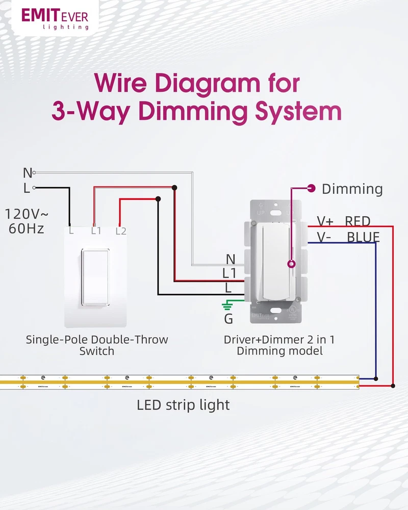 Dimmer Light Switch & 12V 60W Dimmable Driver 2 in 1, UL Listed Single-Pole or 3-Way Slide Dimmer Switches for Lights,120VAC to 12VDC Power Supply for Low Voltage Project, Glossy White Driver & Dimmer 2-in-1 Design: dimmer light switch built-in Driver, no need of separate dimmable power supply and dimmer light switch installations, saving 80% space in junction boxes or tight corners (4.13x2.12x1.99in compact size). Smooth glossy white finish looks great and enhances the feel of your home Single Pole or 3-Way: Circuit settings allow to control the light ON/OFF and can be wired as a single pole (1 switch) or 3-way (2 switches) to control lights from multiple locations. Note: only 1 dimmer switch can be installed in a 3-way circuit Smooth & Reliable Dimming: 12V 60W driver & dimmer switch can easily use sliders for full-range 0.3%-100% with no flicker and no buzzing. Adjust dimming curves and set brightness ranges via the initial brightness controller for work, relaxation, or sleep Safety Protection: UL/cUL Listed, FCC, Class 2 Certified, with protections of short circuit, overload, and over temperature, ensuring safety for both the power supply and your projects Universal Compatibility: Works with 12V DC lighting systems, perfect for strip lights, under-cabinet lights, kitchens, bedrooms and other low-voltage applications for both home and commercial projects. Easy to Install: Compact Slim Design is shallower to easily fit in crowed electrical boxes, directly replacing existing switches or dimmers with traditional single pole or standard 3-way wiring Memory Function: On/Off rocker switch remembers the last dimmed light setting and turns on to that exact light level. Simple and elegant horizontal slider dims and brightens with full range light control