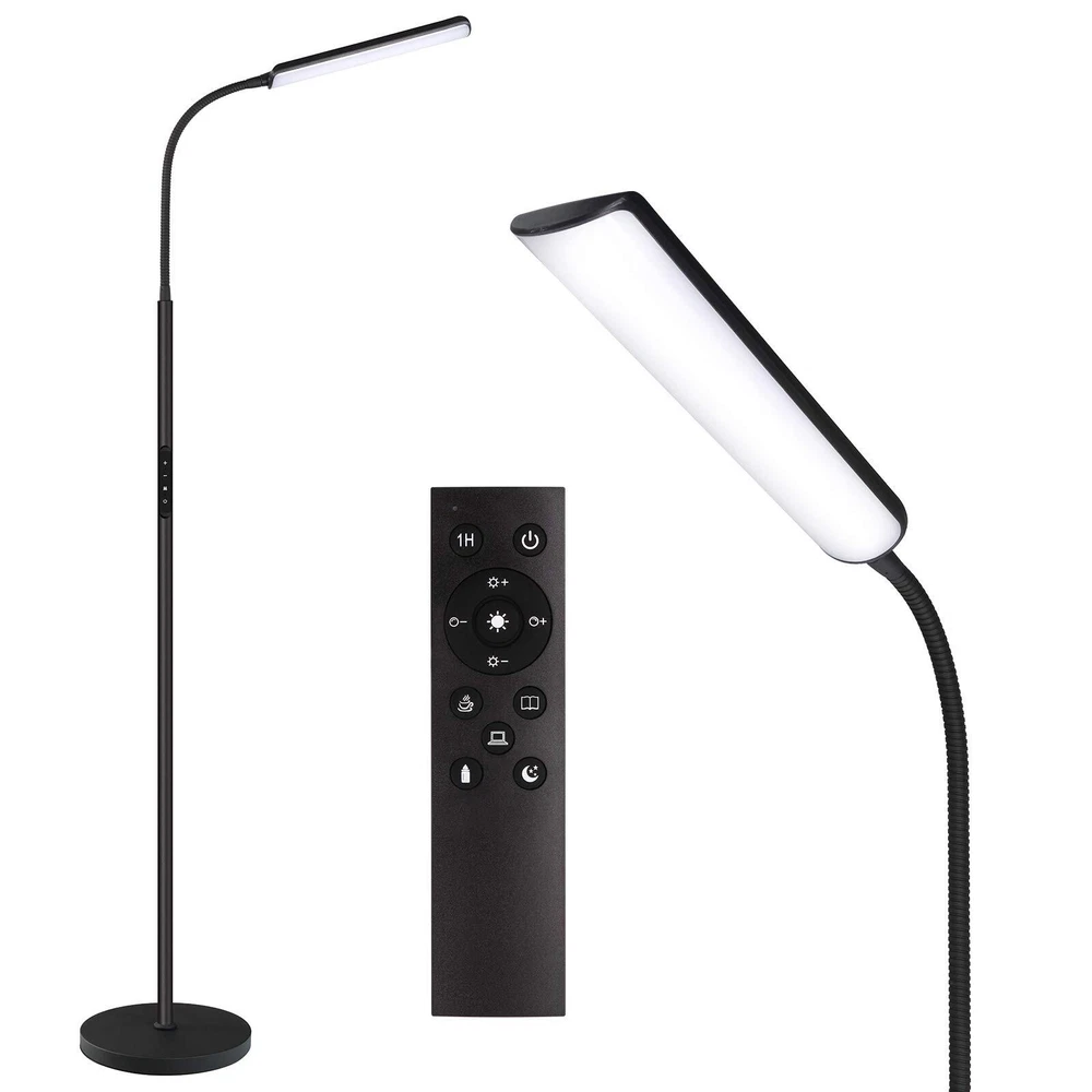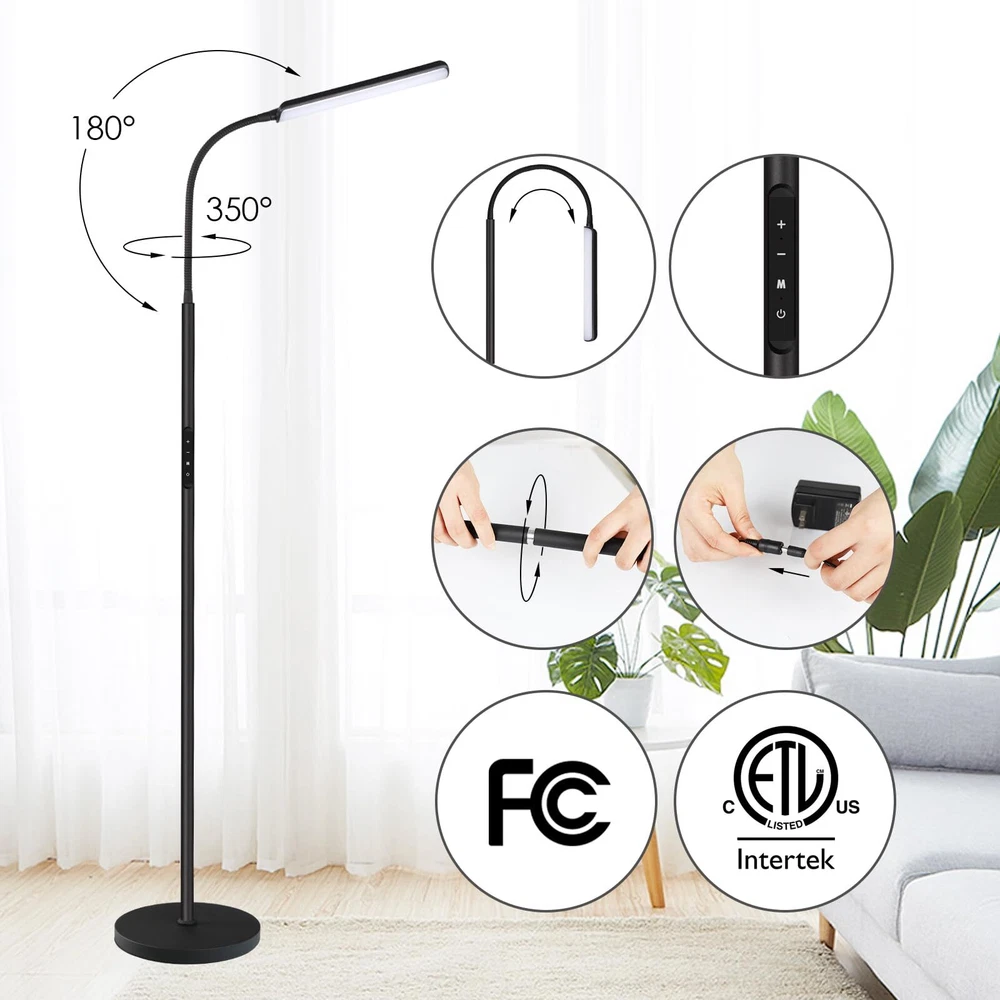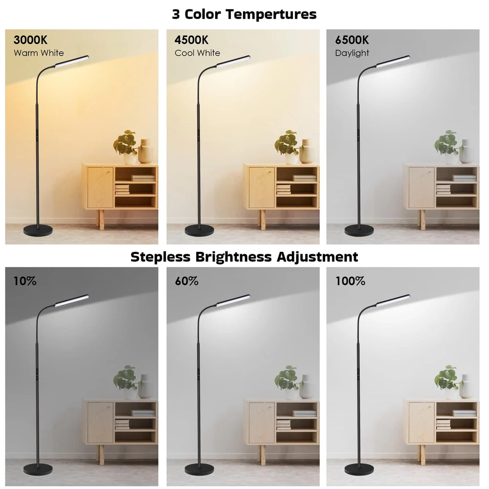 【SUPER BRIGHT LIGHTING】 Dimunt floor lamp build-in 112 pcs high brightness LEDs, and with arcuated lights design which can increase light range, up to 1000 Lumen is enough for reading in living room or bedroom. 15 watts LED tall lamp instead of halogen lamps burning 100 watts, with 50000 Hours long lifetime, you don't need to replace any bulb, very convenient and saving energy. 【ADJUSTABLE COLORS & BRIGHTNESS】This standing lamp customize your experience by choosing Lightness from 10%-100% brightness and stepless color temperature settings ranging from 3000K-6000K, and also has 5 customized model with remote control. One hour timing setting function make you and your baby feel safe and fall in sleep easily. 【SMART REMOTE & TOUCH CONTROL】 You can easily control the floor lamps without leaving the sofa and warm bed with the remote control (with a 52.5.8/16m range). Just press a button ,get the right brightness and color temperature for reading, working, leisure, breastfeeding and sleeping. 【SAFE DESIGN & EYE PROTECTION】We designed the modern floor lamp with your safety in mind. Its weighted base and sturdy design makes it safe around children and pets because it will not easily tip. The LED floor lamp don't heat up so that you do not burn yourself when you touch it. Soft, non-flickering light offer you a cozy experience when reading or playing after long times. 【MEMORY FUNCTION & EASY TO INSTALL】Memory Function can memory your brightness and color with last using. With soft and rotatable gooseneck makes you can control the lights to illuminate any item perfectly. Assembly is easy, just follow the included diagram; no additional tools or parts are needed! Please feel free to email if you need any assistance.