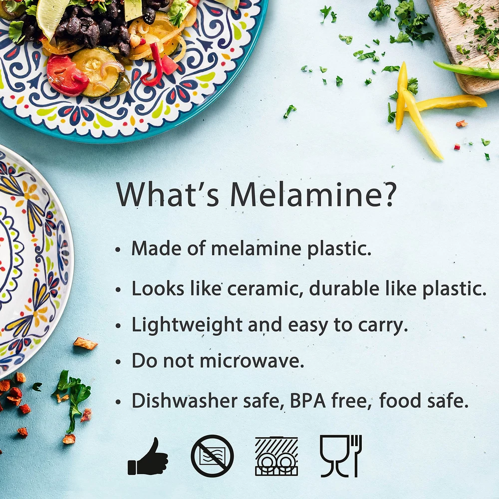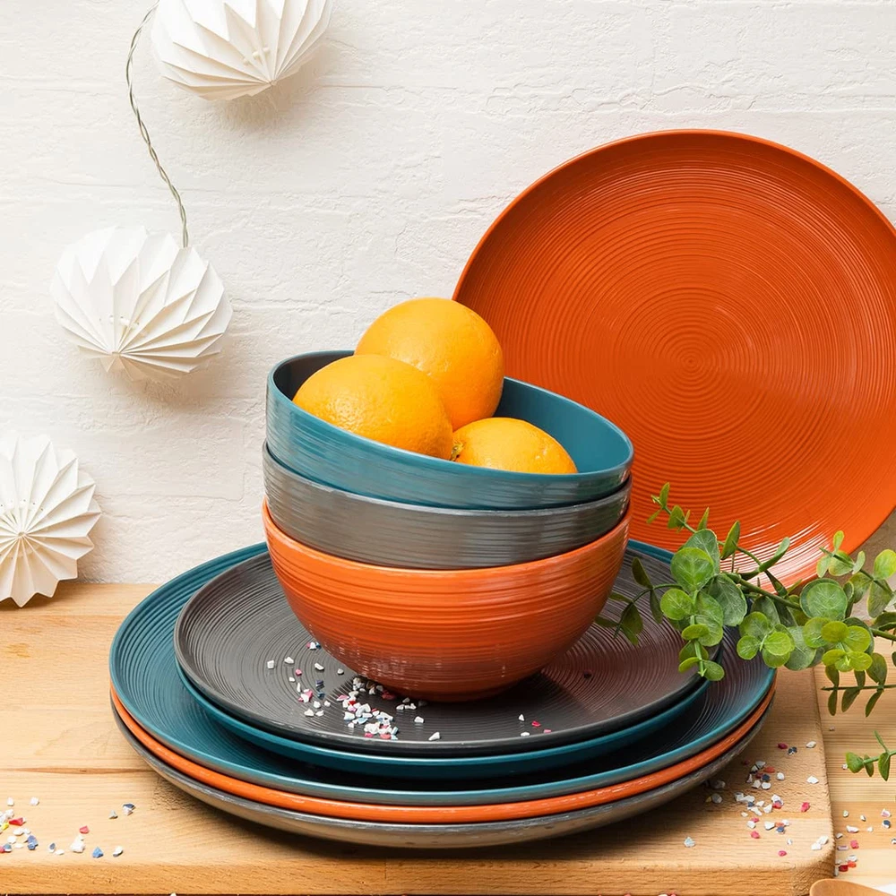 This dinnerware set will give your table a stylish new look. Create the perfect mood for any gathering with the unique style of the American Conventional collection--the simple colors and embossed textures are sure to make a statement. The dinnerware set contains a dinner plate, a salad plate, and a bowl each for four people. It's made of durable melamine, which is dishwasher safe and sturdy enough to be used outdoors as well as indoors. The dishes are also completely BPA free, but should not be microwaved. Set contains 4 dinner plates, 4 salad plates, 4 bowls Embossed textures show unique style Made of durable melamine BPA free - committed to safety Dishwasher safe, do not microwave GREAT EVERYDAY DINNER SET:This 12-piece melamine dinnerware set contains 4 dinner plates (11"), 4 salad plates (9"), and 4 individual bowls (6"x3") that are great for both indoor and outdoor use. The break-resistant design of this nice melamine dinnerware set also makes it ideal for camping or for use in RVs and trailers. SAFE MATERIAL:This American Conventional dinnerware set is made of melamine, a durable material that is 100% BPA free as well as top rack dishwasher safe; do not microwave. UNIQUE STYLE:These melamine bowls and plates have the unique style of the American Conventional collection - the simple colors and embossed textures are sure to make a statement. PERFECT GIFT: Enjoy your meals with our charming melamine dinnerware set. Get a set for yourself and another as a gift for anyone with a taste for the unique. AESTHETIC AND FUNCTIONAL:The modern embossed design tastefully layers together and makes a nice addition to existing dinnerware pieces, table linen, and surrounding decor. This dinnerware set is perfect for both everyday use and special occasions.