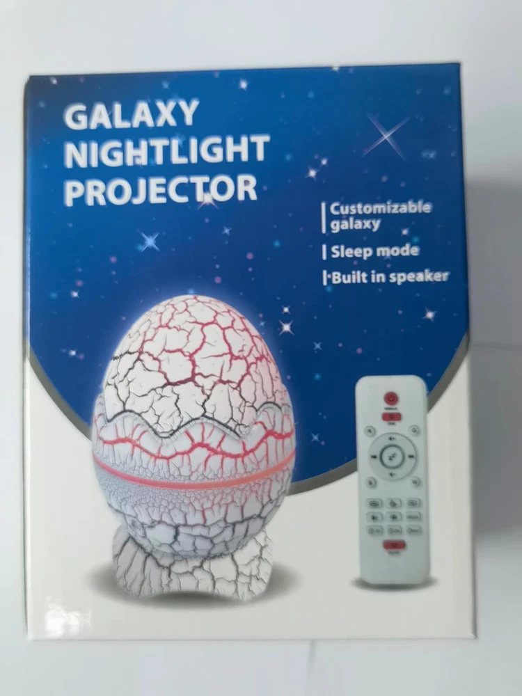 ✨【 Dinosaur Egg Night Light Projector】: The combination of nebula and starlights can turn on alone or in combination(up to 14 colors), and the projection of nebula flow creates a relaxing atmosphere, 4 speed and brightnesses. The high-definition starry galaxy can be projected onto the wall and ceiling, You will feel like you are travelling in the galaxy 📶【Bluetooth Music Speaker/Player With Dynamic Rhythm】: After Connected the device via Bluetooth to turn it into a music player, play your favorite music. The lights will flash and dance following the music rhythm. We can open a small music party with our kids 💤【Not only night light but also white noise machine】: The White Noise Machine is implanting with 19 music such as Forests, Birds, Bonfire, Train, Rain, Sea and so on. You can choose whichever one you like before your bedtime to help you fall alseep well in the beautiful starry sky ⏰【Timer Function & 2 Modes】: You can set up 1h, 2h & 4h timer via the remote or the buttons in the egg. Remote working range is within 5 meters. After enjoying starry lights, you can put on the shell onto the projector, it will be become a warm night light 💡【Ideal Gift & 100% satisfied After-Sell SERVICES】: Dinosaur Egg Galaxy Star Projector Starry Light is cute design as well as a great gift choice for holidays (Christmas, Valentine's Day, Children's Day, etc.) and birthdays. If you are not satisfied with our Galaxy Star Projector Starry Sky Night Light, any problems with the item, please feel free to contact us, we provide 180 days after sales service. Product Description Dinosaur Egg Galaxy Starry Sky Projector with Wireless Music Player 1 X Dinosaur Egg Galaxy Starry Sky Projector 1 X Remote control 1 X USB C cable 1 X User manual Dinosaur Egg Galaxy Star Projector Night Light The best gift and decoration for children's and adults' bedrooms Materials: ABS LED powder: 6W Power consumption: 7-10W Power supply: USB DC 5V, 2000mA Projection coverage: 20-80sq.m Applied environment: Indoor application Working temperature: -10℃ to 45℃ Night light Wireless music player White noise Fog Timer Remote control Dinosaur Egg Night Light Projector it is powered only via USB DC 5V. With the remote control, you have your hands free to turn the projector on and off. This way we can have more fun with our children and family. Wireless music player We can connect our phone or music player to the light projector via Bluetooth. It becomes a loudspeaker and the light will flash and dance with your music rhythm. White Noise Machine The starry sky projector is implanted with 19 music like forests, birds, campfire, train, rain, sea and so on Timer function You can set the 1-hour, 2-hour and 4-hour timer using the remote control or the buttons on the star projector. Setting the brightness You can adjust the brightness of the star projector with the remote control, with settings of 30%, 50% and 100% brightness 14 light colours set in the Galaxy Star Projector There are green, blue, purple, red, yellow, orange and other colours set. Choose one as your favourite while playing games, having party or sleeping