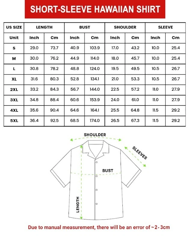 This is a personalized product. Please provide complete and accurate information (fill in the personalization box or send it via message) so we can design the best version for you. Product Description Bring island vibes to your wardrobe with our Hawaiian Shirt , designed for comfort, style, and vibrant color. Featuring full-surface, edge-to-edge printing , this shirt is perfect for vacations, summer outings, beach days, parties, or everyday casual wear. Product Details Style: Hawaiian / Aloha Shirt Fit: Unisex relaxed fit Material: High-quality polyester fabric Fabric Features: Lightweight and breathable Smooth, soft feel Quick-drying and wrinkle-resistant Printing: Full-color all-over sublimation print Design covers the entire shirt surface Colors remain vibrant wash after wash Design & Construction Short sleeves Button-down front Classic collar Professionally sewn for durability Printed using premium sublimation technology for long-lasting results Care Instructions Machine wash cold , separately Tumble dry low heat Do not bleach Do not iron directly on printed areas Do not dry clean Processing & Shipping Processing Time: 3-5 business days Shipping Time: 7-10 business days (U.S. only) Shipping time does NOT include Saturdays, Sundays, or holidays We always aim to ship orders as quickly as possible: During off-peak months , orders may arrive earlier than estimated During peak seasons (holidays or high order volume), shipping may take slightly longer Sizing Notes (Important) Please refer to the size chart before ordering Manual measurements may vary by 1-3 cm Fit is designed to be relaxed and comfortable Perfect For Beach vacations & summer trips Parties, festivals & themed events Casual everyday wear Unique and fun gifts for birthdays, holidays, or special occasions Our products may be manufactured either in the U.S. or at overseas facilities, depending on availability and production capacity at the time. This is to ensure that we deliver the best possible quality to you. Please rest assured and place your trust in us.