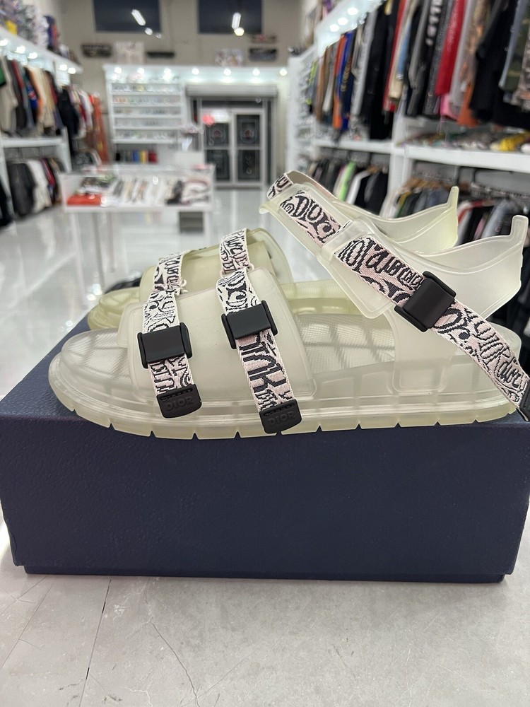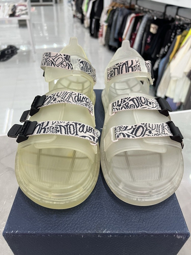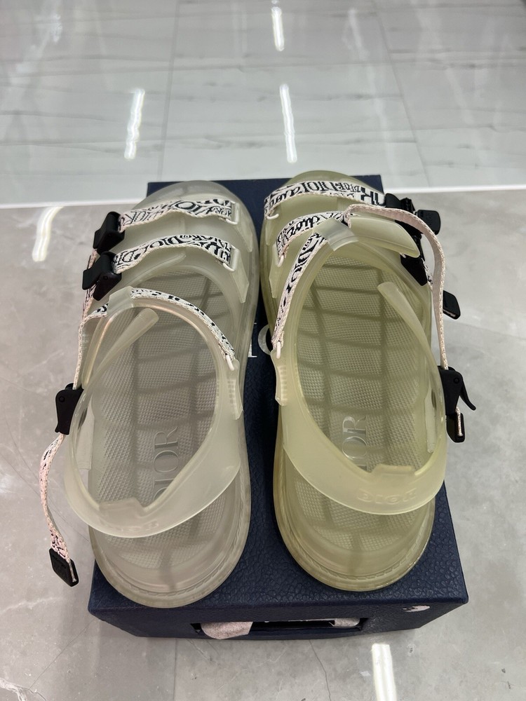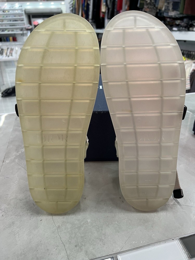 Slides/Sandals are new, but have been tried on. Additionally, the right pair is discolored and less transparent, while the left pair is more clear.