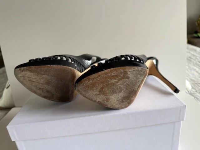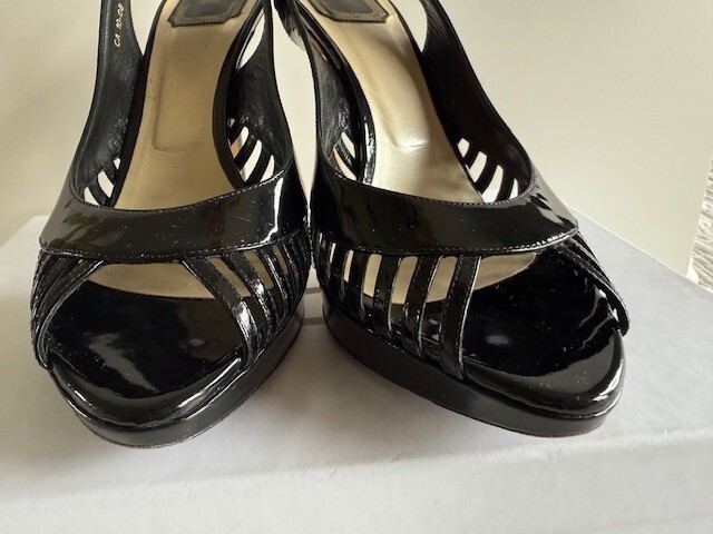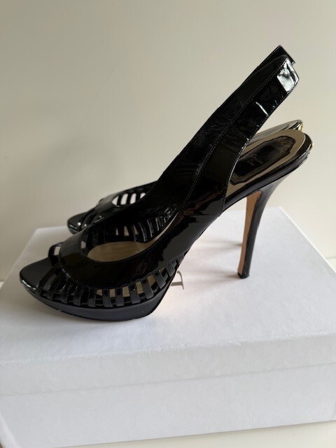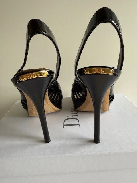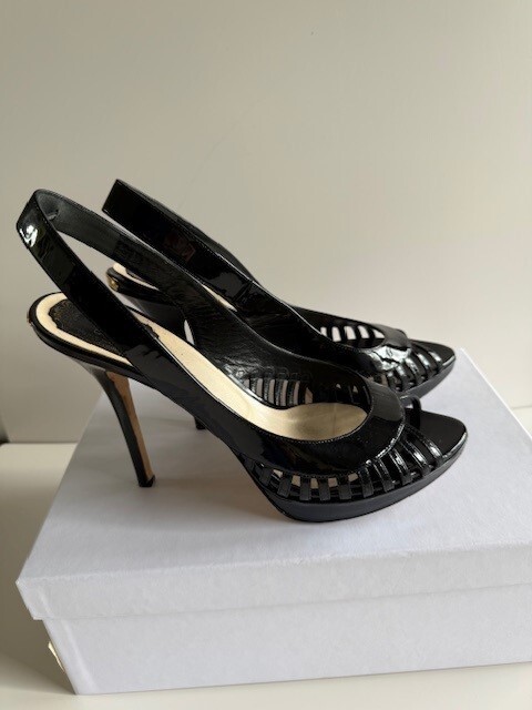 Own a pair of $750 Designer Shoes for only $160!!! Dior Whisper Sling back Black Patent Leather Pumps Size 9.5 (40) w/ Box & 1 Bag! These are beautiful shoes, I always got compliments when I wore them. I wear anywhere from a 9 to a 10 depending on the designer. These shoes are very comfortable to me! See all pictures as the are part of the description. Contact me for any questions. They are in good used condition. Heels are 4.5" Front platform is .5" Smoke free home!
