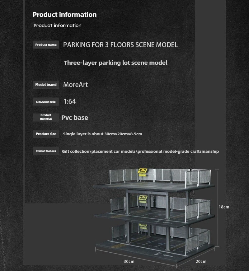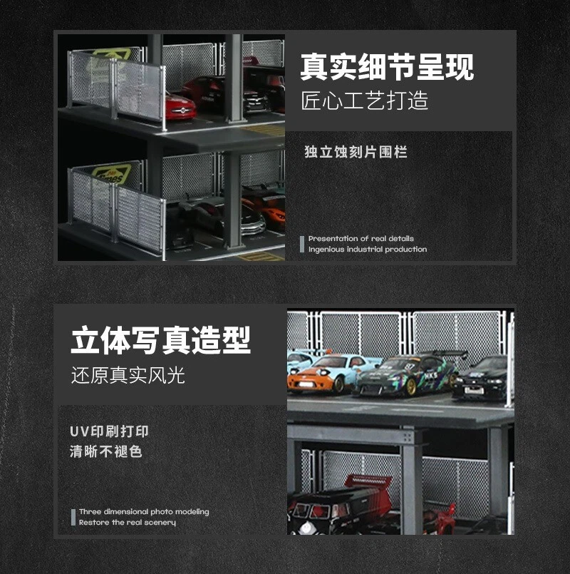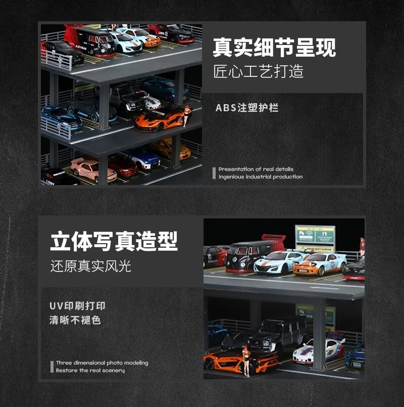 Product Description: Please Note: Not Support LED Lighting,kindly please know it~ ** Vehicle and figure models are not included, the pictures are for reference only** We highly recommend this product for use with our other Diorama Scene Models products. It can also be used with vehicle models and figure models. The playability is very high. We look forward to your combination and play! We show some combination effect pictures in the product images for reference~. Product Specifications: Fully handmade, the production process takes a long time [except vehicles and dolls in the picture]. Material: PVC base + ABS engraved bottom bracket + acrylic cutting board Product size: about 30*20*8.5cm Model Condition: Brand New Size: As shown in the picture Note: You need to assemble it by yourself. This product can be assembled in minutes without glue or scissors. Package Included: 1 Set Car Garage Model