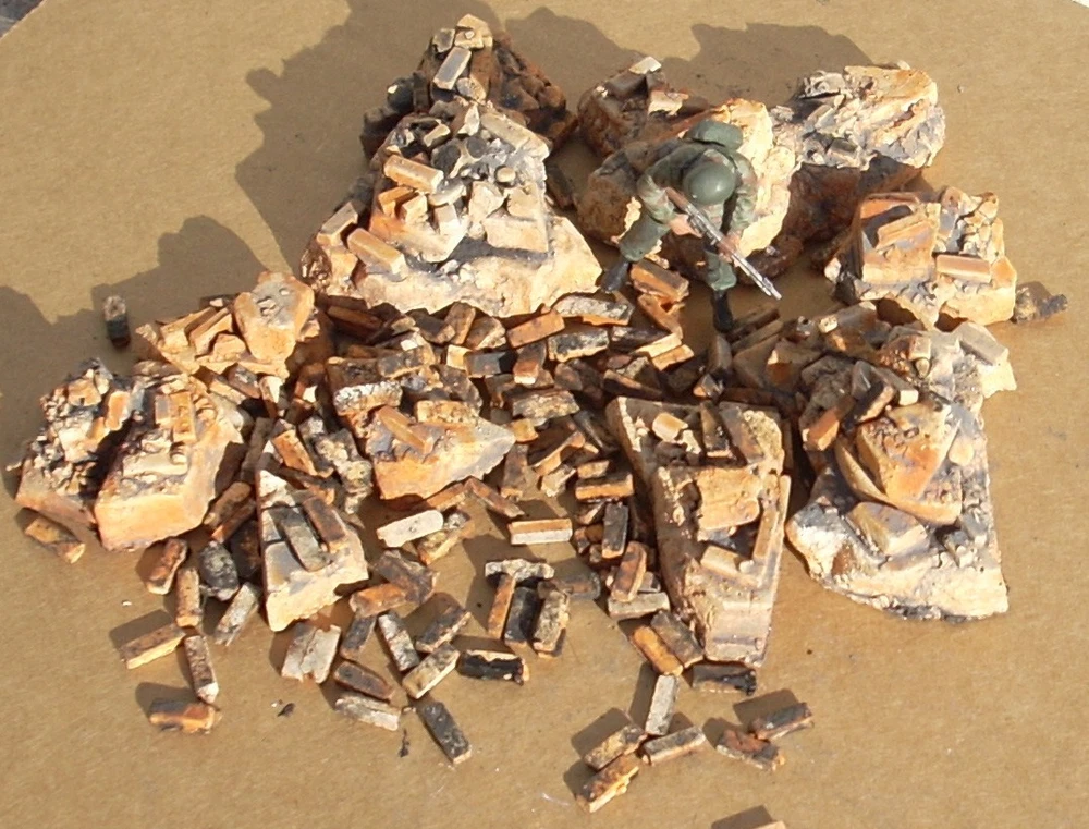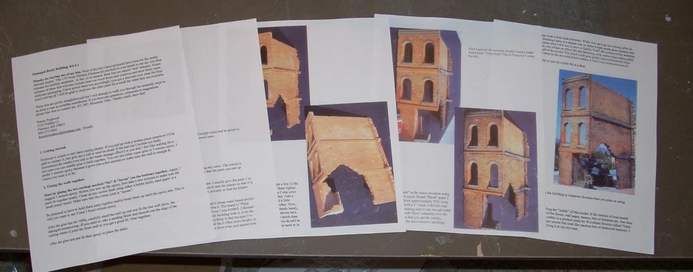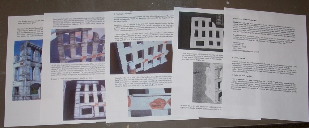 The best kits you can buy for 3 reasons!! One. Attention to detail & realism. All of the original pattern work is hand carved by an artisan for maximum realism. This allows Dioramas Plus kits to include details you'll never find in other kits. Missing and chipped bricks, "ghost' staircases and walls, crumbling stucco and cracked and weathered concrete. If you can find it in real life you'll see it in a Dioramas Plus kit! Two. Ease of construction. We try & keep the kits simple so you can get to the fun part (painting & weathering the buildings) in about 15 minutes. Our instructions are second to none, with complete, easy to understand instructions that walk you through each and every step along the way, from basic assembly to painting & weathering the model. Three. Customer service. Got a question about weathering your model? Give us a call. End up with a broken part somehow? We'll replace the parts for free. Paint your first hydrocal kit & you're unhappy with the way it came out? Drop us an email & we'll send you a second set of castings so that you can try again. Why do we do this? Because we want you to have fun with our kits and to be happy with your finished results. If you need anything at all touch base with us & we'll help you out. Our customer service is second to none. 100% positive feedback! Special! I'll throw in an 8" x 10" base (a $15 value) at no extra charge. Here is an unsolicited comment from a customer that just built his first Dioramas Plus kit; "Wanted to let you know your diorama sneak attack ,the realism work that you put into it is awesome along with clear instructions. The added parts was plus and appreciated. I had bought one other diorama from another manufacture before yours, it was such a headache it went into the trash. It has been awhile since I have been into models,making dioramas your dioramas will make it much more interesting and fun. looking forward to more dioramas. Thank you!" "Just finished constructing your "Brick Ruins". This is by far the best kit I have ever purchased from anybody. Since I built one of your buildings I of course have ********** and ******** buildings in mind as a comparison, since they are your only real competition. Reasons for putting you above all others? Good price. Perfect shipping and amazing effort to pack the model so it is not broken during delivery. Real genuine accuracy as to scale. You know European buildings often have those 12' ceilings, which you duplicate in the brick ruins, whereas the other two makers I mention have first floors (Europeans would say ground floors) of ok scale dimensions, but the upper floors are only for 4' tall scale people at best. Next, your attention to detail is outstanding, and the kit was complete (many other mfg's kits are missing pieces) and easy to assemble because all the parts are present and they all fit together. I personally have built but intensely dislike vacuform building kits since none of the parts fit without serious modifications."Bob H. Check out the sample pictures of our detailed, yet easy to understand full color illustrated instructions. IMO they are the best in the business. We want you to be able to build as nice of a model as the one you see on the box cover. Instructions shown are samples, the ones you receive with your kit are written and illustrated specifically for it. The reason customers call these the best diorama kits available is because they combine amazing, contest quality detail with super easy construction. All of the master patterns were hand created by a master X Hollywood Scenic artist and are detailed right down to the bullet holes in the stucco. Unlike finicky vaccuform kits which require you to glue numerous thin plastic walls together, spackle or patch the seams and then try to paint the slick plastic to look like masonry, these Dioramas Plus kit usually just feature 3 or 4 precast sections that can be glued together in about 15 minutes so you can move on to the fun part, painting & detailing your diorama. Since the parts are cast hydrocal ( a very hard casting plaster) it's incredibly easy to get a realistic finish to your model. Complete, full color instructions (see photos of sample instructions above) walk you through step by step of the building & painting process, and if that weren't enough, you are more than welcome to contact me via email or phone if you have any questions or problems, as I love to see people have fun with our kits and get good results. All pictures are of actual model! Amazing, contest quality detail!! Free extra set of our cast rubble & bricks (a $12 value) + a free sample of our amazing laser cut glass w/bullet holes! DIORAMAS PLUS SNEAK ATTACK MODEL KIT KIT FEATURES: BEAUTIFULLY DETAILED HYDROCAL PLASTER CASTINGS LASER CUT WOOD WINDOWS WITH ADHESIVE BACKING FOR QUICK ASSEMBLY LASER CUT SHATTERED GLASS CAST RUBBLE & BRICKS COMPLETE, FULL COLOR, EASY TO UNDERSTAND PAINTING AND AGING INSTRUCTIONS APPROXIMATELY 12" X 9" BASE AND TANK NOT INCLUDED ITEM COMES UNASSEMBLED AND UNPAINTED