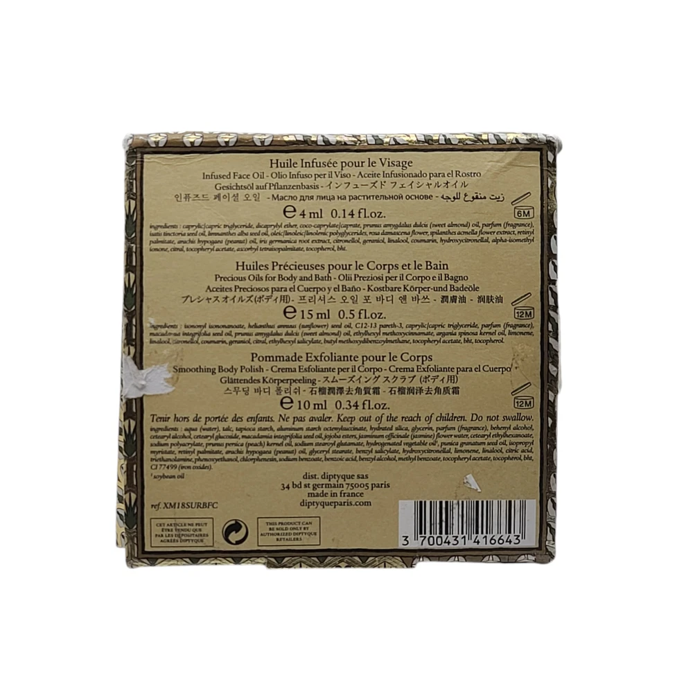 KleverKosmetics Our eBay Store About Us Contact Us Add to Favorite Sellers Diptyque L'Art Du Soin Set Bath Body Precious Oil+Face Oil+Polish *Impefect Box* ** This Diptyque set is Brand New. The box has some slight tears. Please refer to pictures. You will receive what is pictured. ** A three-piece set presented in an ornament-style box that's perfect for giving. Set includes:- Precious Oils for Body and Bath (0.25 oz.): an oil designed to be gently massaged into skin to leave it smoothed, nourished and enhanced, or diluted in the bath to neutralize the effects of hard water and act as a protective emollient- Smoothing Body Polish (0.33 oz.): a polish that gently removes dead skin cells while pomegranate oil and its mild, creamy texture create smooth, soft skin- Infused Face Oil (0.33 oz.): a fast-absorbing, nonoily multi-use oil that contains real rose petals that continually release hydration into the skin. Diptyque L'Art Du Soin SET Bath Body Precious Oil + Face Oil + Polish. Limited Diptyque ** This Diptyque set is Brand New. The box has some slight tears. Please refer to pictures. You will receive what is pictured. ** Return and Refund Information • Please be aware that colors on the screen may appear slightly different in person. • Please be familiar with product. Feel free to contact us if you have any questions. • DUE TO HEALTH AND SANITARY ISSUES CONCERNING COSMETICS OR SKINCARE WE DO NOT ACCEPT RETURNS ON THESE ITEMS. ALL SALES ARE FINAL. • WE WILL ONLY ACCEPT RETURNS WHEN THE ERROR IS ON OUR END. • Attention VeRO members: We're not affiliated with or endorsed by the companies mentioned in this listing. All trademarks and copyrights are acknowledged, they are only used for informative description of the items offered for sale. Warranty information We are not an authorized dealer of this product and any warranty included with the product may not be honored by the manufacturer.