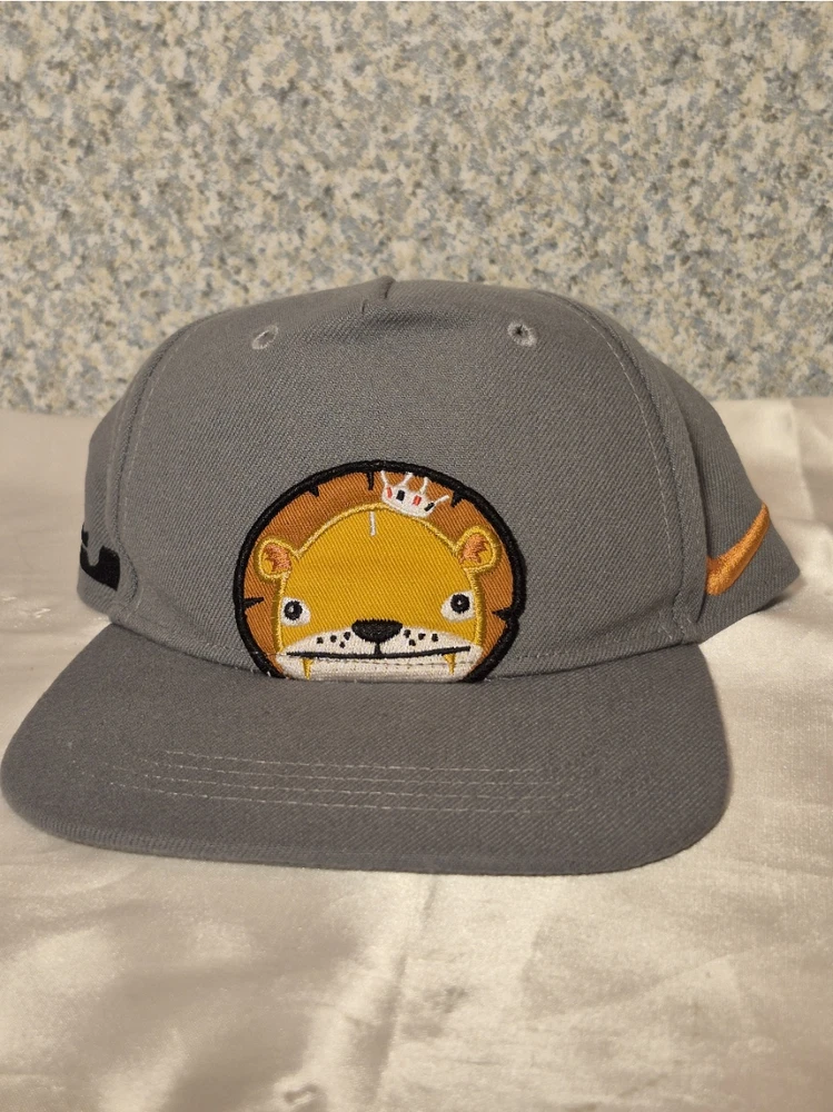 This is a discontinued Nike LeBron James Heart of a Lion toddler snapback cap. It describes the cap as pre-owned but in excellent condition, made of 100% cotton, and designed for toddlers with a head circumference of 18.5 to 21.5 inches. The cap is gray, features an embroidered cartoon lion logo with a crown, and has an orange Nike swoosh on the side, fitting most children ages 1 to 4 years old. Thank you for visiting.