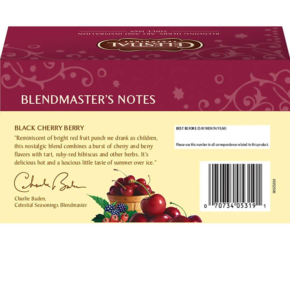 Six 20 count boxes of Black Cherry Berry Herbal tea bags Infused with hibiscus, rosehips and natural berry flavors Caffeine and gluten free No artificial flavors, colors or artificial preservatives Steep in hot water for 4-6 minutes for the perfect cup Celestial Seasonings Black Cherry Berry Herbal Tea is the perfect way to unwind and relax after a long day. Our caffeine and gluten-free tea blend is infused with hibiscus, rosehips and berries. We achieve this sweet and tart flavor profile without the use of any artificial flavors, colors or artificial preservatives. To reduce excess waste, our tea bags are stringless and come packaged in recycled boxes. Simply steep a tea bag in hot water for 4-6 minutes for the perfect cup. Includes six 20-count boxes of Celestial Seasonings Black Cherry Berry Herbal Tea. Celestial Seasonings teas are an invitation to bring the perfect balance to your day. From herbal teas to chai and matcha lattes and everything in between, there’s a Celestial blend that’s just right for any occasion. We blend our teas using the finest herbs, teas, spices and botanicals available, and we lovingly package them in engaging, thoughtful boxes that truly represent the goodness found inside.