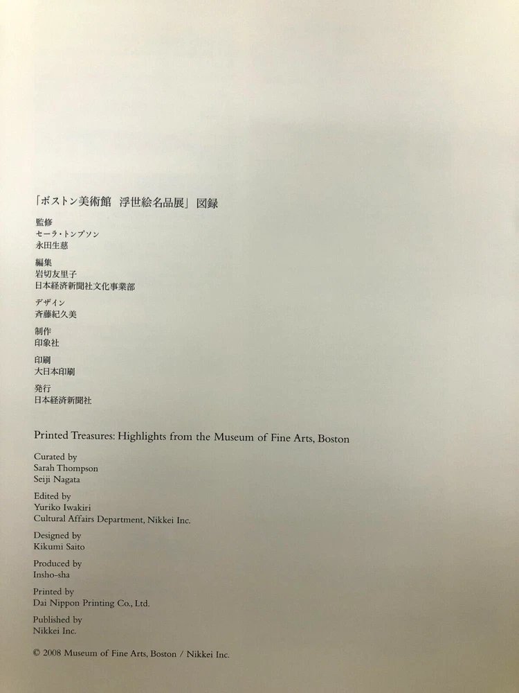 Topic: Abstract Art, Art Criticism, Art History, Artists, Buddhism, Calligraphy, Classic Modern Art, Contemporary Art, Cultural History, Culture, Exhibitions, Fine Arts, Modern Art, Museums, Paintings, Popular Culture, Print Art, Japan, Japanese, Shunga Publication Year: 2008 Genre: Art & Culture Original Language: Japanese Country/Region of Manufacture: Japan Language: Japanese Seller Notes: “slight feeling of age / light scratches or other, but overall good” Book Title: Printed Treasures Highlights from the Museum of Fine Arts BOSTON Author: N/A Type: Picture Book
