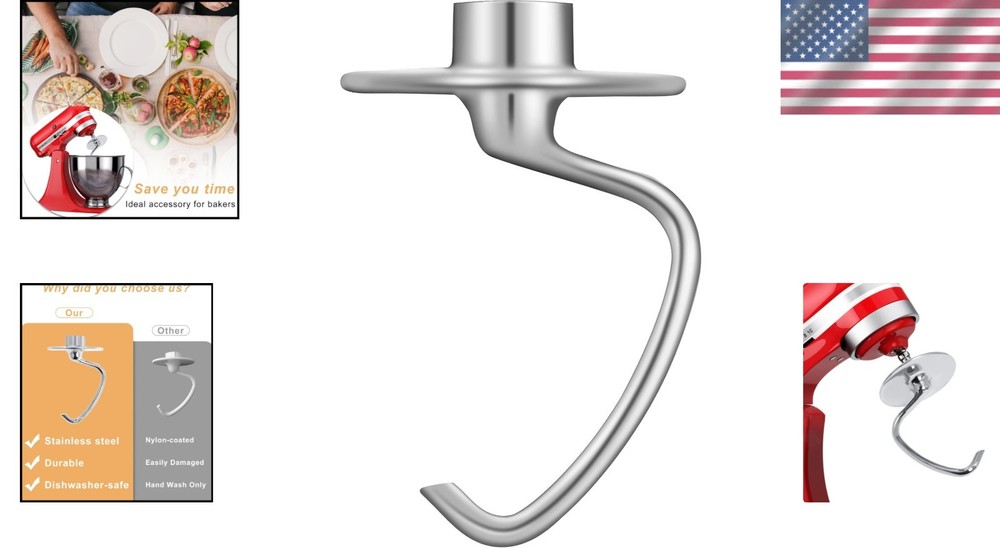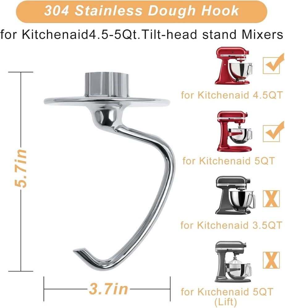 Dishwasher-Safe Dough Hook for Kitchen-Aid Stand Mixer - Easy Clean & Rust-Proof ‹ › ‹ › ‹ › ‹ › ‹ › ‹ › ‹ › ‹ › ‹ › ‹ › Dishwasher-Safe Dough Hook for Your Kitchen-Aid Stand Mixer Elevate your baking experience with our dough hook, designed to make mixing and kneading as effortless as possible. Suitable for a range of Kitchen-Aid tilt-head stand mixers, this durable attachment promises to complement your kitchen beautifully. Product Features: Perfect Fit: Compatible with Kitchen-Aid 4.5QT and 5 QT tilt-head stand mixers, fitting models such as K45, KSM75, KSM90, and many more. High-Quality Material: Made from 304 stainless steel, this dough hook is completely rust-proof and free from coatings, ensuring longevity and durability. Efficient Functionality: Designed specifically for mixing and kneading yeast dough, this attachment transforms the way you prepare your favorite baked goods. Versatile Use: Perfect for mixing dough for bread, pizza, bagels, and fresh pasta, streamlining your kitchen prep time and minimizing hand fatigue. Easy to Clean: Dishwasher-safe for effortless cleanup, allowing you to focus on what you love—creating delicious baked treats. Why Choose Our Dough Hook? Say goodbye to tired hands and inefficient mixing! Our stainless steel dough hook stands out as the superior choice compared to traditional coated alternatives. Its unique C-shaped design effortlessly mixes and kneads dough, making it a must-have for both the casual baker and the seasoned professional. Experience the joy of baking with ease and precision—order your Dishwasher-Safe Dough Hook today and unlock a world of baking possibilities! Shipping Free & Fast Shipping - We offer free shipping to most of the USA with a normal delivery time of 3-7 days. However, due to the current situation, additional delivery time (up to 3 weeks) may be required for some items. Alternative Carriers - We may use alternative carriers (e.g. USPS, FedEx, UPS, etc.) to ensure your package arrives safely and on time. Due to the use of multiple carriers, we are unable to provide a tracking number automatically. Handling Time - Orders are processed and shipped within 1-2 business days of receiving cleared payment. Shipping Restrictions - Shipping to Alaska, Hawaii, Puerto Rico, Guam, and other US territories may incur shipping charges or delivery restrictions. Please contact us before ordering, or your order can be refunded/cancelled. State Restrictions - There may be restrictions based on your state of purchase. For example, certain items may not be shipped to California due to state regulations. Contact for Tracking Updates - If you require tracking updates or have any concerns about the delivery of your order, please feel free to contact us, and we will be happy to assist you. Return 30-Day Hassle-Free Returns - We want you to be completely satisfied with your purchase. If you are not, you can return the item within 30 days of receiving it for a full refund or exchange. Easy Return Process - To start a return, simply contact us and we will provide you with a prepaid return shipping label and detailed instructions. Restocking Fee - There are no restocking fees for returns. However, the buyer is responsible for return shipping costs if the return is not due to a seller's error. Refund Processing Time - Refunds will be processed within 5 business days of receiving the returned item in its condition. Payment We accept all major credit cards, PayPal, and Apple Pay for your convenience. Your payment information is secure and encrypted to ensure a safe and seamless transaction. Please complete your payment within 3 days of purchase to avoid any delays in shipping. Feedback Your feedback is extremely important to us. We strive to provide the best products and customer service possible. If you are satisfied with your purchase, please take a moment to leave us a positive review. If you have any concerns or issues with your order, please contact us before leaving negative feedback. We are committed to resolving any problems and ensuring your satisfaction. Contact Us If you have any questions or concerns, please feel free to out to our customer support team. You can contact us through the eBay messaging system. We are available Monday to Friday, 9:00 am to 5:00 pm EST, and we will do our best to respond to your inquiry within 24 hours. Buy it now and enjoy a pleasant shopping experience! Unit Quantity: 1 Components Included: Dough Hook Appliance Uses: Dough,Bread,Pizza,Bagels,Pasta Appliance Capabilities: Knead,Mix Features: Dishwasher Safe,C-shaped design Model: KitchenAid Dough Hook Attachment Number of Items: 1 Color: Silver Type: Mixer Attachment Material: 304 Stainless Steel Finish: Glossy Item Depth: 4.13 in Item Weight: 1.13 oz Unit Type: oz