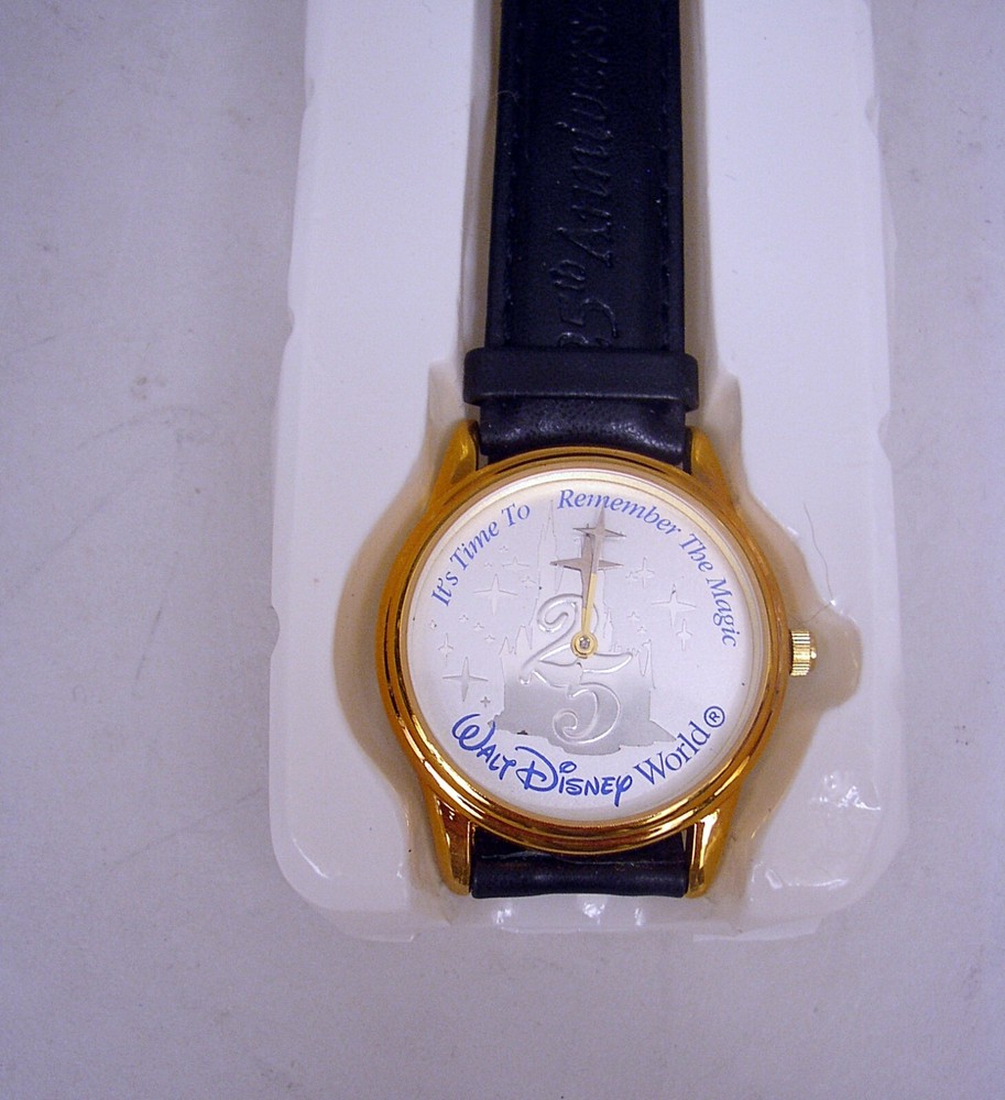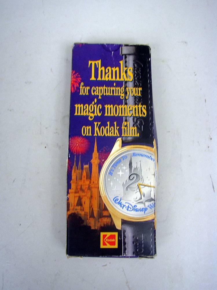 Welcome To My Dolly Dearest on eBay.....an experience in collecting! 1997 Disney 25th Anniversary Watch by Eastman Kodak Disney 25th Anniversary Watch designed and manufactured by Eastman Kodak in 1997. The dial is silver and features Cinderella's castle with 25 in the center. Around the perimeter of the dial is says "Walt Disney World" & "It's Time To Remember The Magic" and "Walt Disney World®". The watch has a black leather band that is imprinted on the band "25th Anniversary" and "Walt Disney World". There is a star on the end of each hand. It comes packed in it's original box (shows storage wear and crushing but has protected the watch), still in the original liner, and has never been used. It will need a new battery and band. Being sold "AS IS". PLEASE NOTE: Due to the age of the watch, where the band connects to the watch has disintegrated. The band will need to be repaired. * * * * * * * * * * * * Shipping for this item is $7.50 in the lower 48 states and includes tracking Additional Shipping Charge To Alaska & Hawaii * * *PLEASE NOTE: * * * Due to the alarming high rate of non-paying bidders, payment is required immediately after purchase. Every item is described in detail and each item is sold "as is" with no implied or inferred warranties or claims. Many items sold are vintage, used, or old store stock and may not be perfect. It may not be known if items are smoke or pet free and do our best to point out any defects or flaws. If something is not in the picture, do not assume it is included unless stated in the description. If in doubt, please send us a message through ebay's "contact seller" link. eBay is powered by feedback and we are very proud of our 100% positive feedback rating. In the event you are not completely satisfied with your purchase, please contact us DIRECTLY before opening a case with eBay or leaving negative or neutral feedback. We will do our best to make this a good experience for you on eBay.