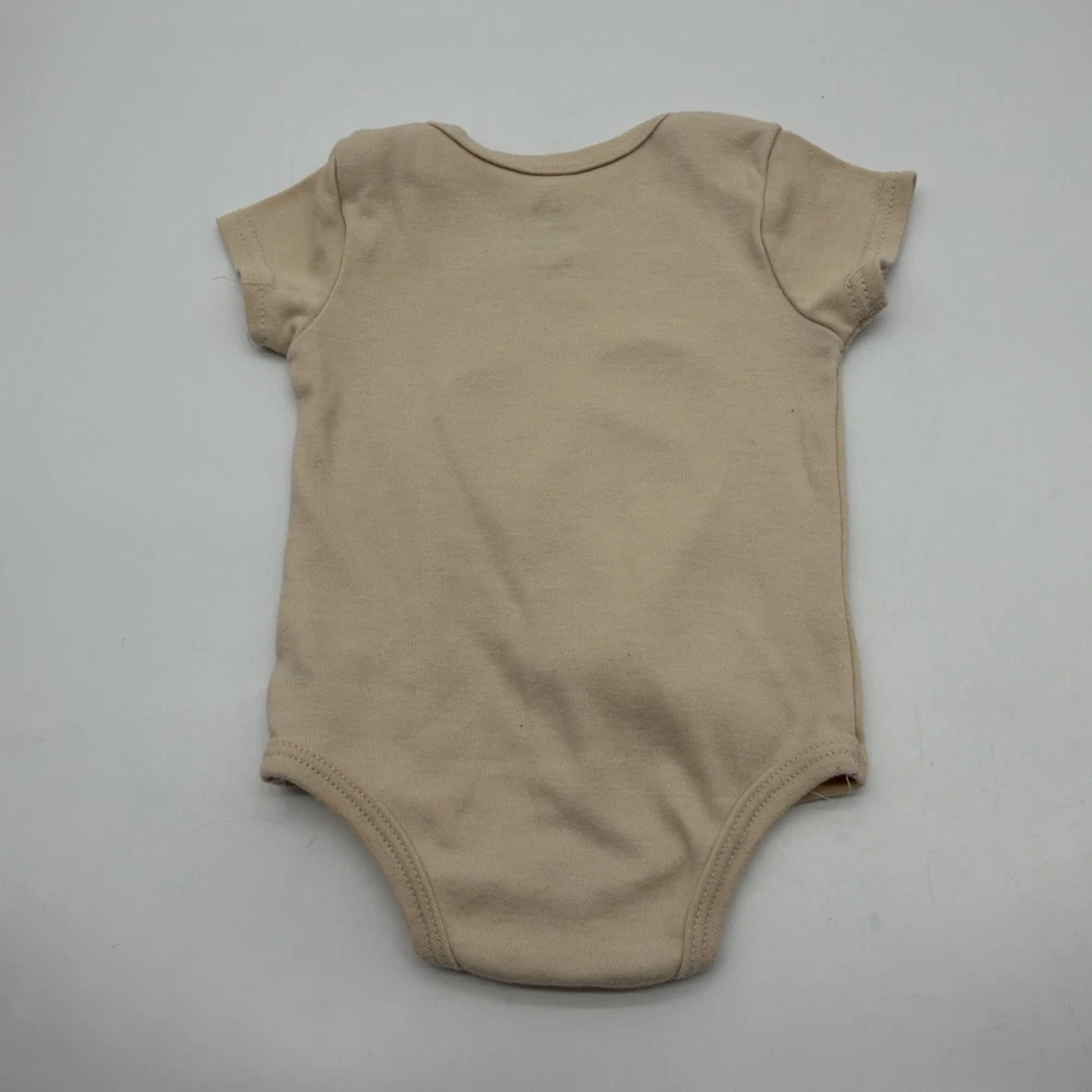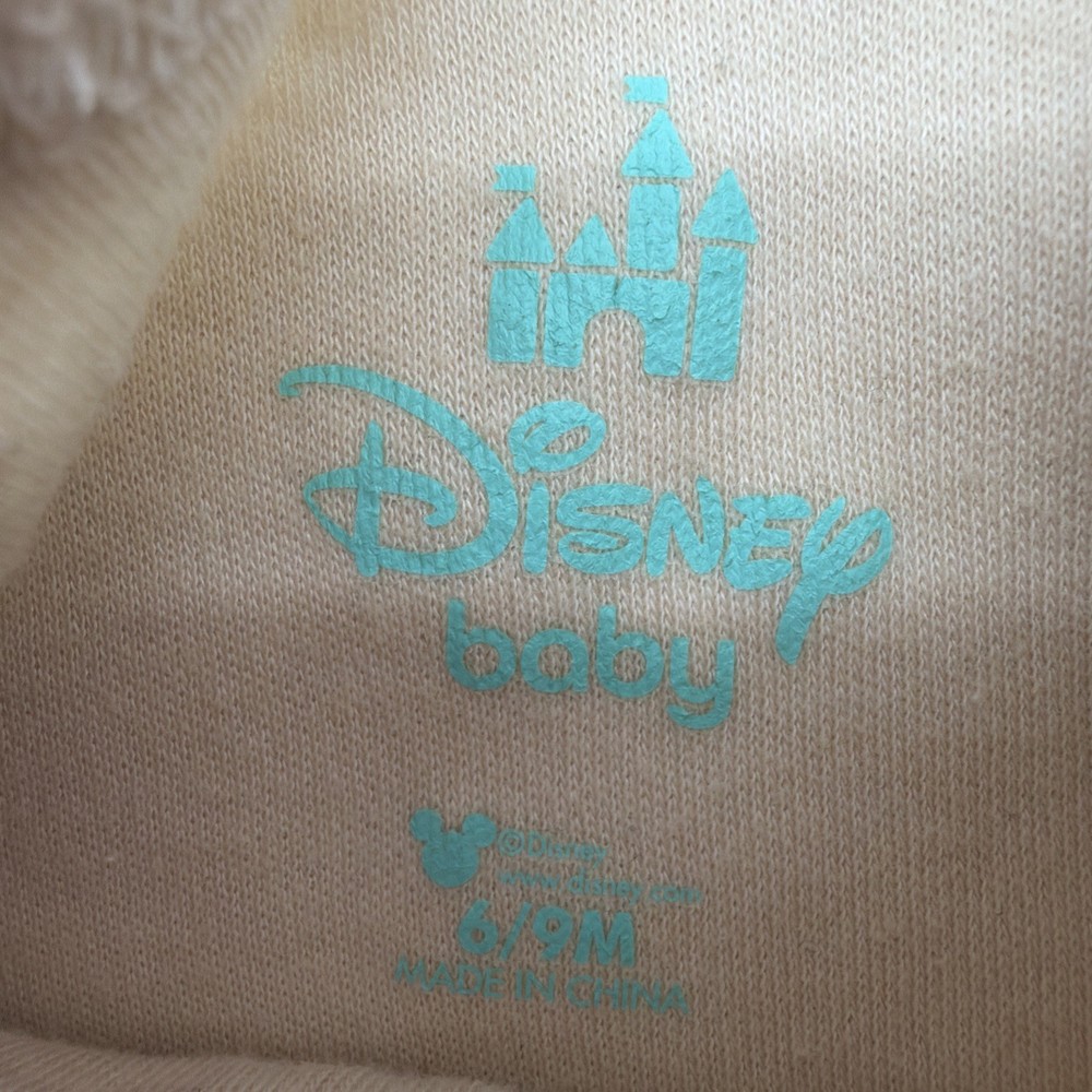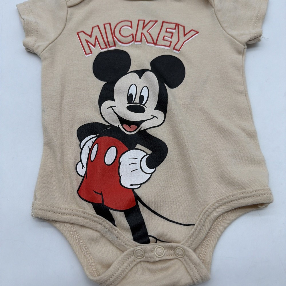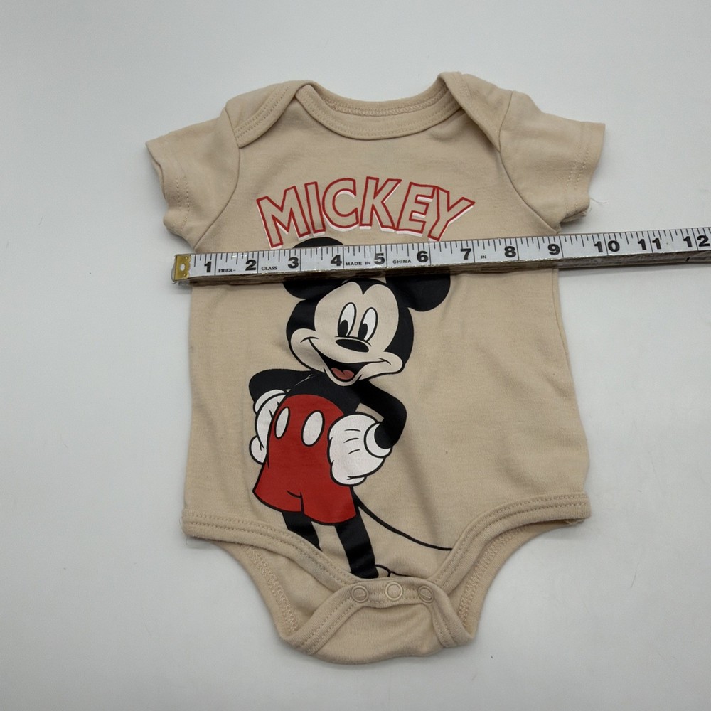 The Disney Baby One Toddler Girls Size 6-9M Beige Graphic Print Logo Snap bodysuit features a cute Mickey Mouse character design on a solid beige background. With short sleeves, chest snap closure, and a crew neckline, this one-piece outfit is perfect for travel, parties, or casual wear. The bodysuit is made from comfortable fabric and is suitable for all seasons, making it a versatile addition to any young girl's wardrobe. Perfect for walking, beach outings, or running and jogging, this stylish Disney Baby outfit is sure to delight both parents and little ones alike. Check pictures for flaws and measurements