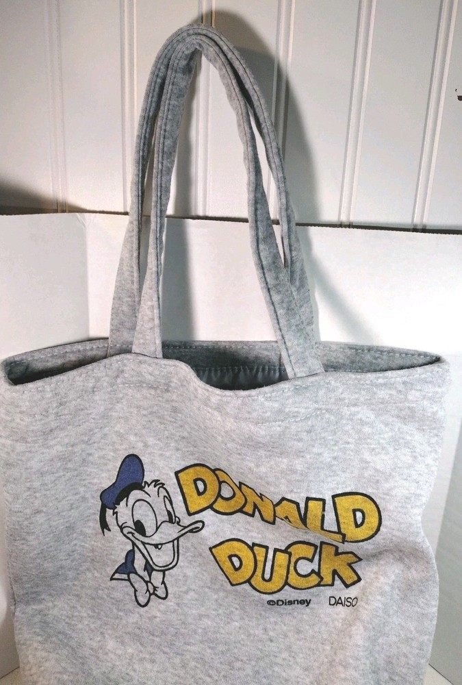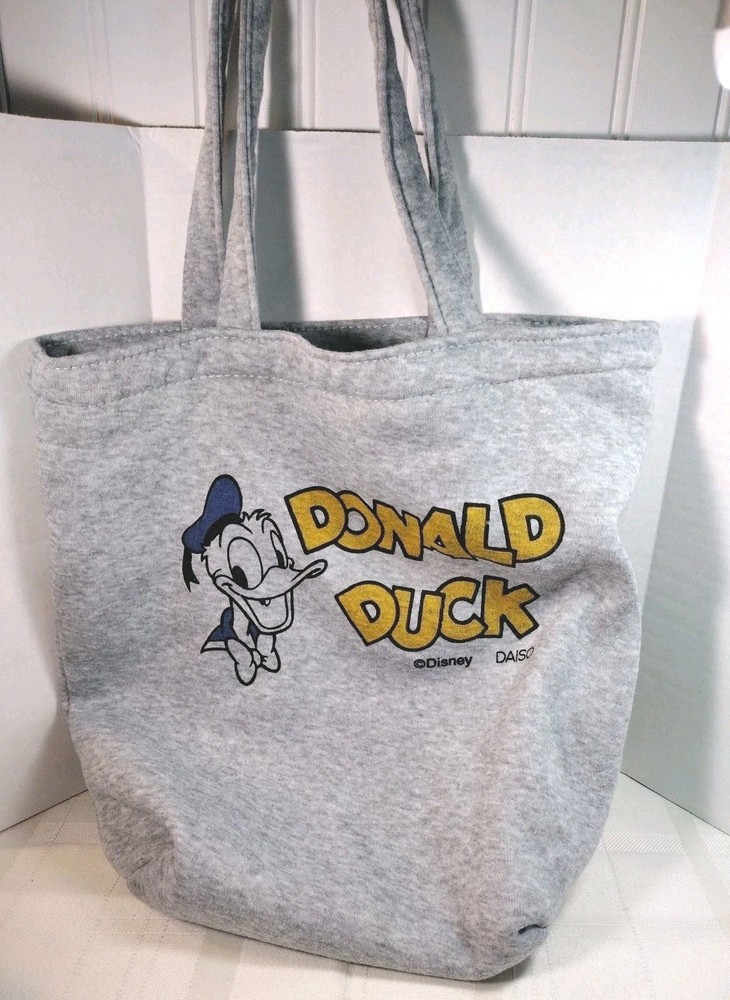 Nice Donald Duck Disney bag can be used in many different ways for lunches to take to work picnics could be used as a purse gray nice fabric like sweatshirt fabric and insulation in the inside like if you put lunch in it or a cold drink no stains great condition just washed measures 13 inches plus another 7 inches for the Straps . 13 inches wide