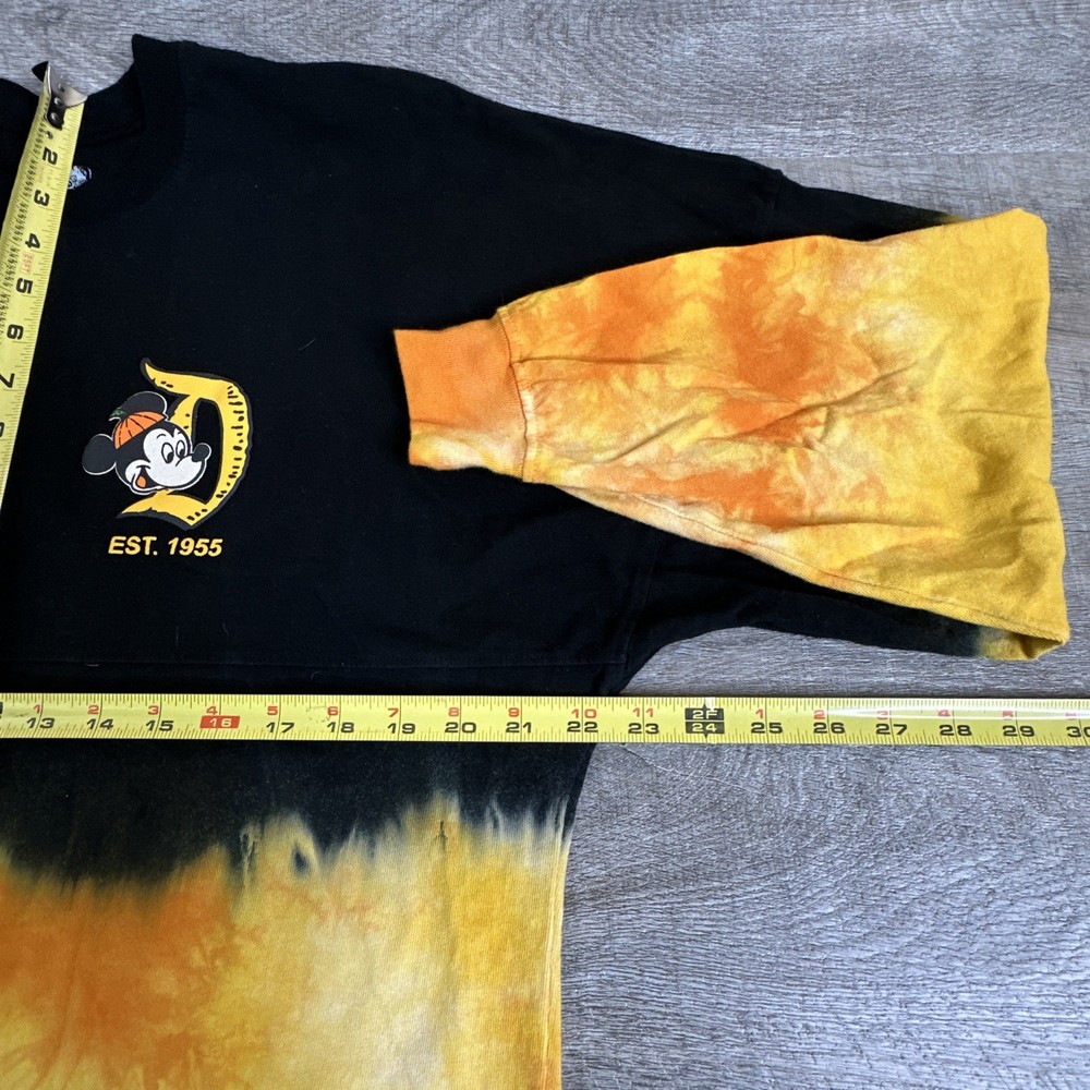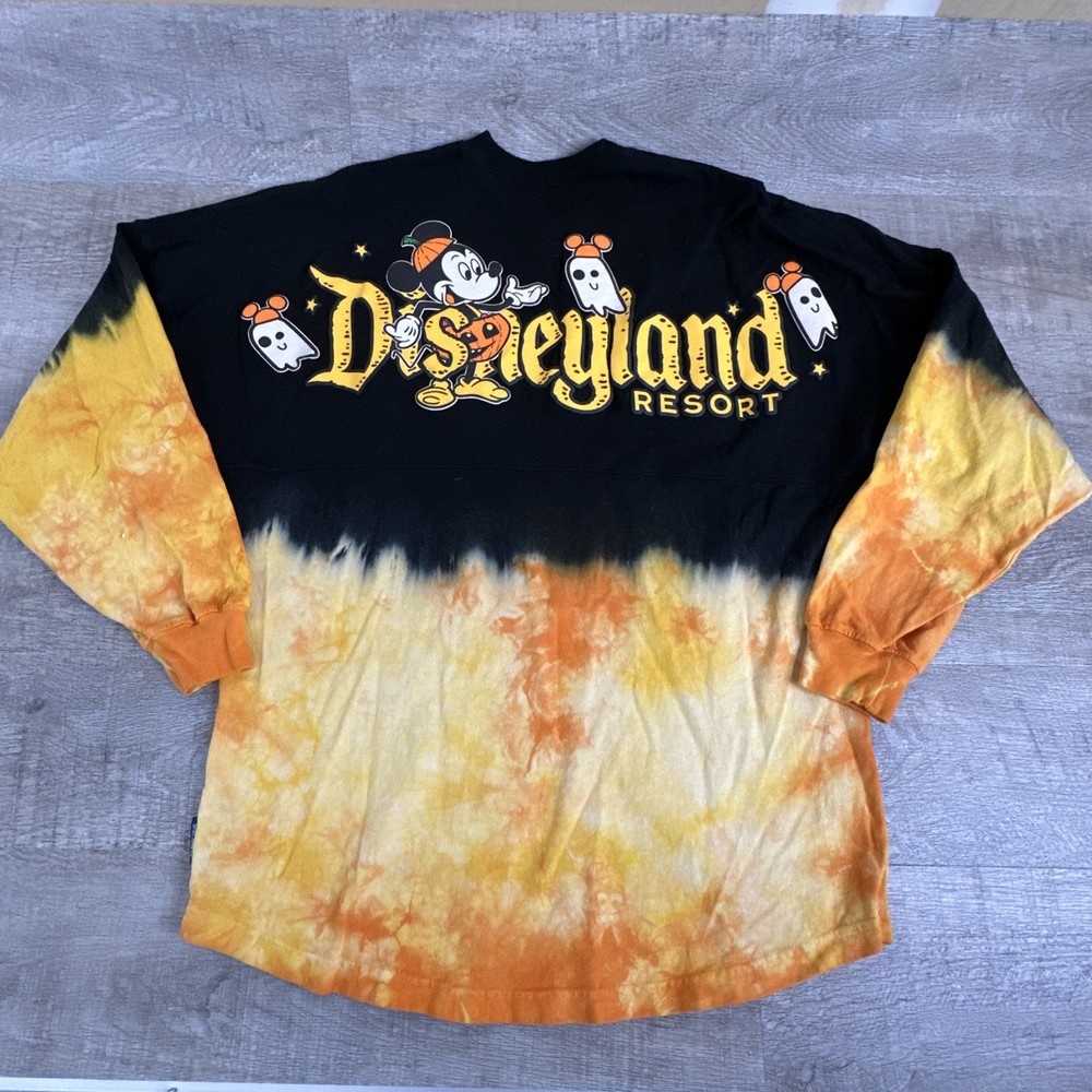 The Disney Halloween Mickey Mouse Spirit Jersey T-Shirt is a tie-dye top featuring the beloved character Mickey Mouse from the Disney franchise. This women's shirt in size small is perfect for adult fans looking to add a fun and festive touch to their Halloween or Disney-themed outfits. The tie-dye design adds a unique and colorful element to the classic Mickey Mouse imagery, making it a collectible item for Disneyana enthusiasts.
