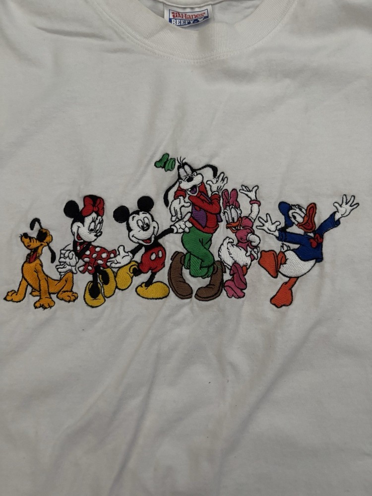 vintage 1990's Disney Mickey Mouse embroidered t-shirt!! for those of you who love disney or have disney nostalgia, this is the perfect piece to display your love for the iconic franchise. in perfect condition! this is a size medium white shirt with embroidered mickey mouse, minnie mouse, donald duck, daisy duck, pluto, and goofy! open to offers! every order comes with free goodies :)