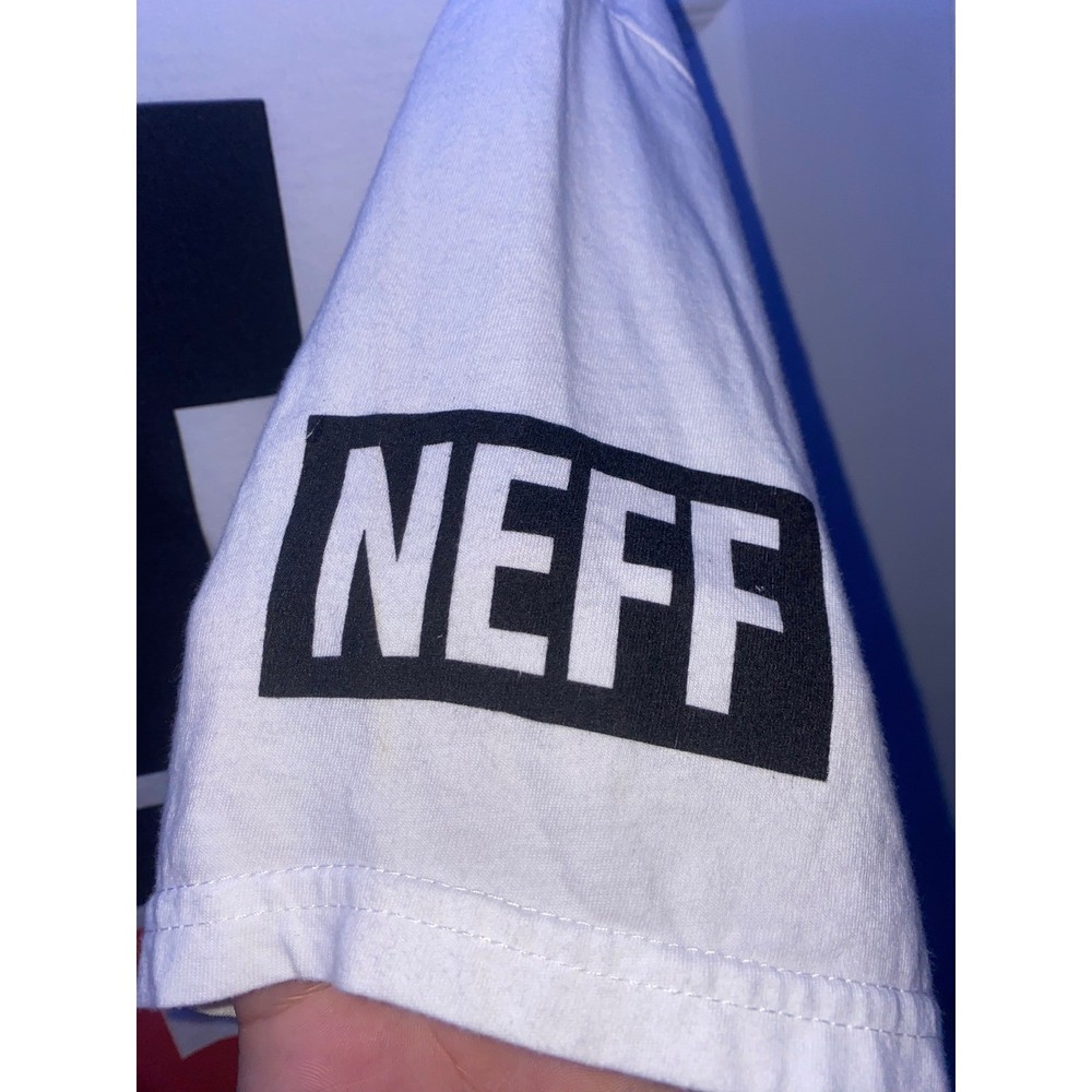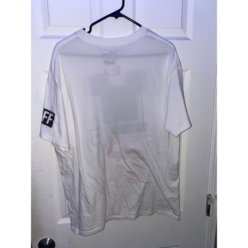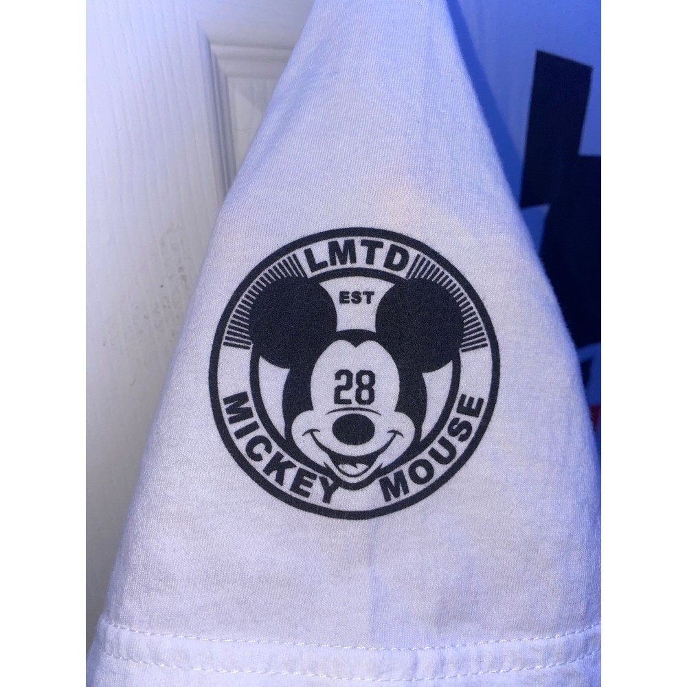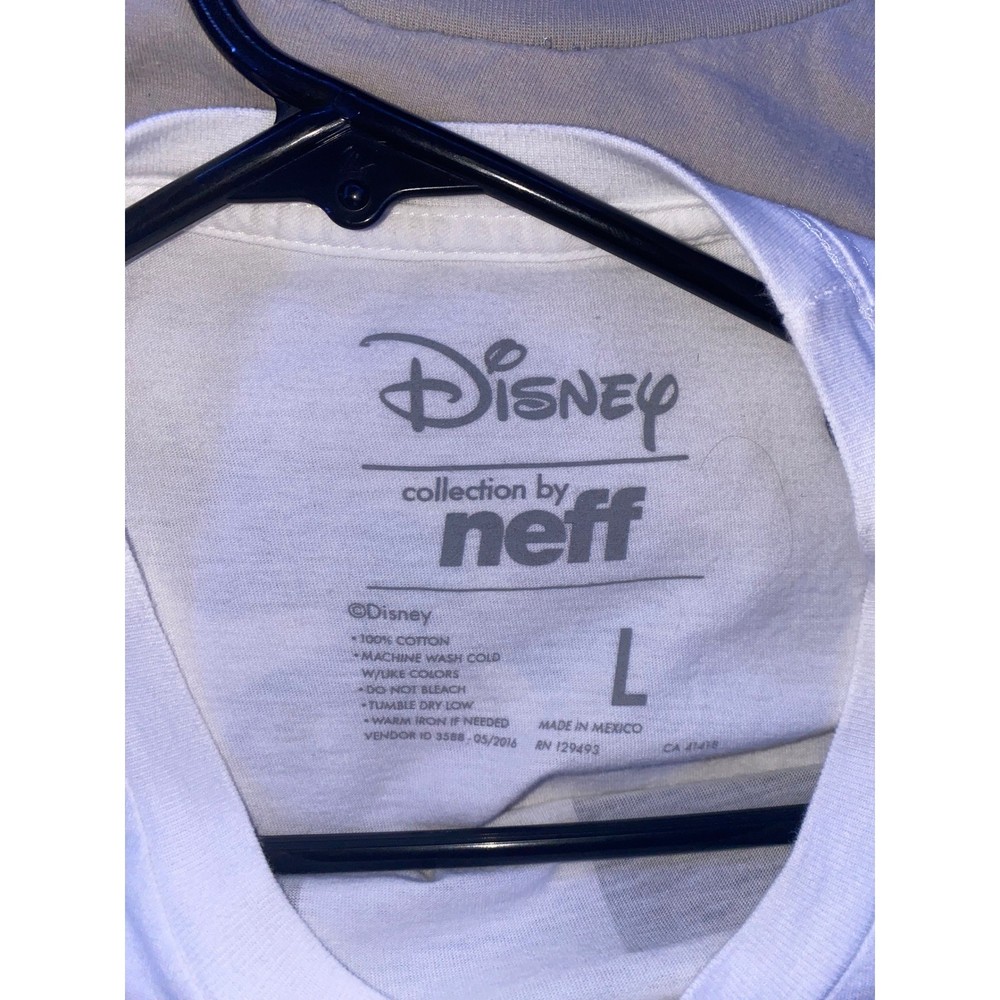 Disney collection by Neff short sleeve t-shirt features a bold, geometric abstract Mickey Mouse graphic on the front. This white cotton tee includes a 'NEFF' block logo on one sleeve and a 'LMTD EST 28 Mickey Mouse' circular crest on the other. Designed with a comfortable crew neck and a standard fit, it offers a modern streetwear take on a classic character.