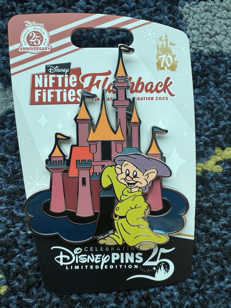 The Disney Niftie Fifties Flashback Castle Characters Dopey Mini Jumbo LE 500 Pin is an exclusive collectible featuring Dopey from the Disney franchise. This single pin on pin design, released in 2025, celebrates the Niftie Fifties Event theme. Limited to only 500 pieces, this unique pin showcases a mini jumbo size and is a must-have for Disney collectors looking to add a rare and special item to their collection.
