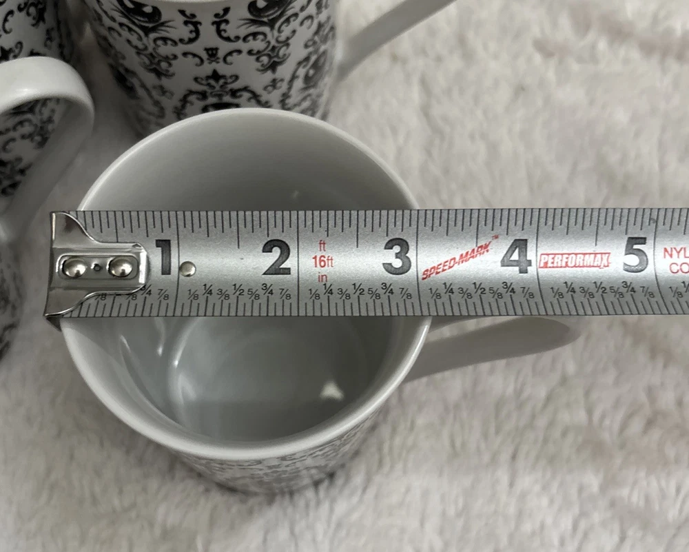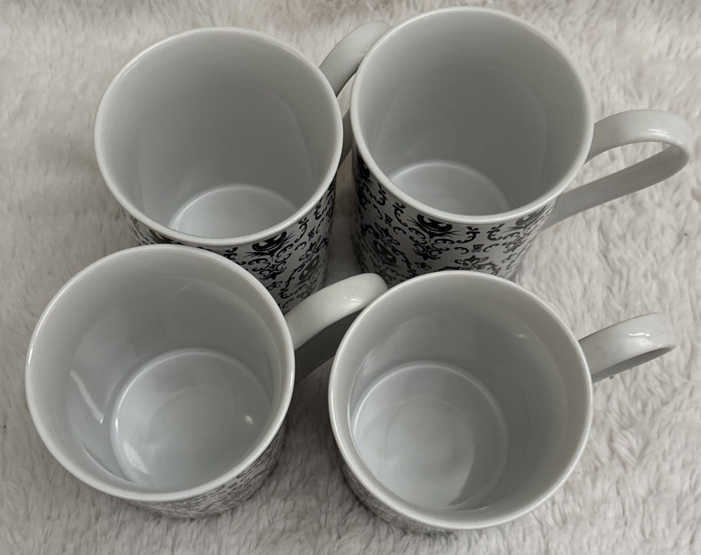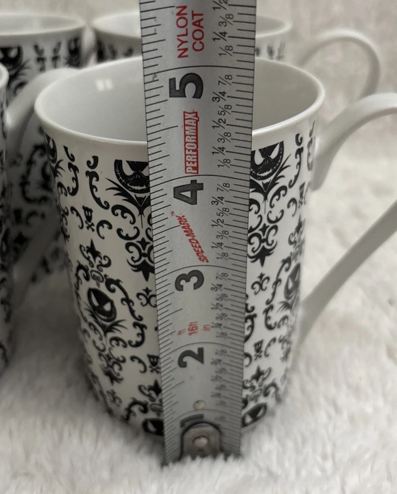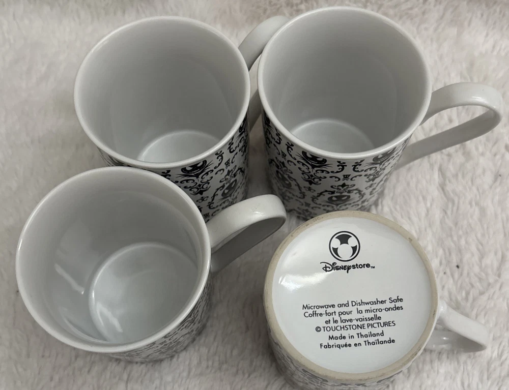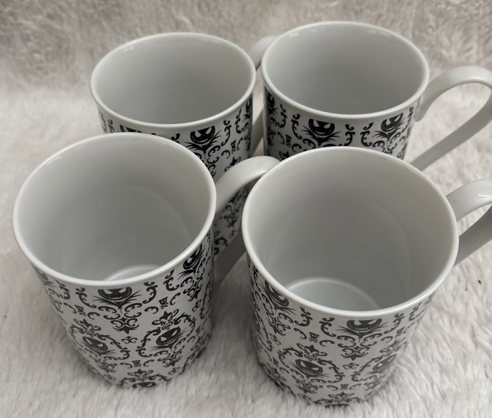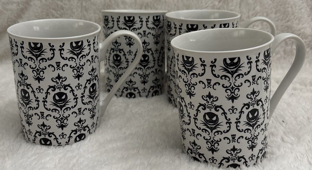 This set of four Disney Nightmare Before Christmas coffee mugs features the iconic character Jack Skellington in a black and white design. Made by Disney Store, these mugs are a must-have for fans of the franchise and collectors alike. Imported from Thailand, these contemporary mugs are perfect for enjoying a comforting cup of coffee while showcasing your love for the beloved Disney story. No chips they were used