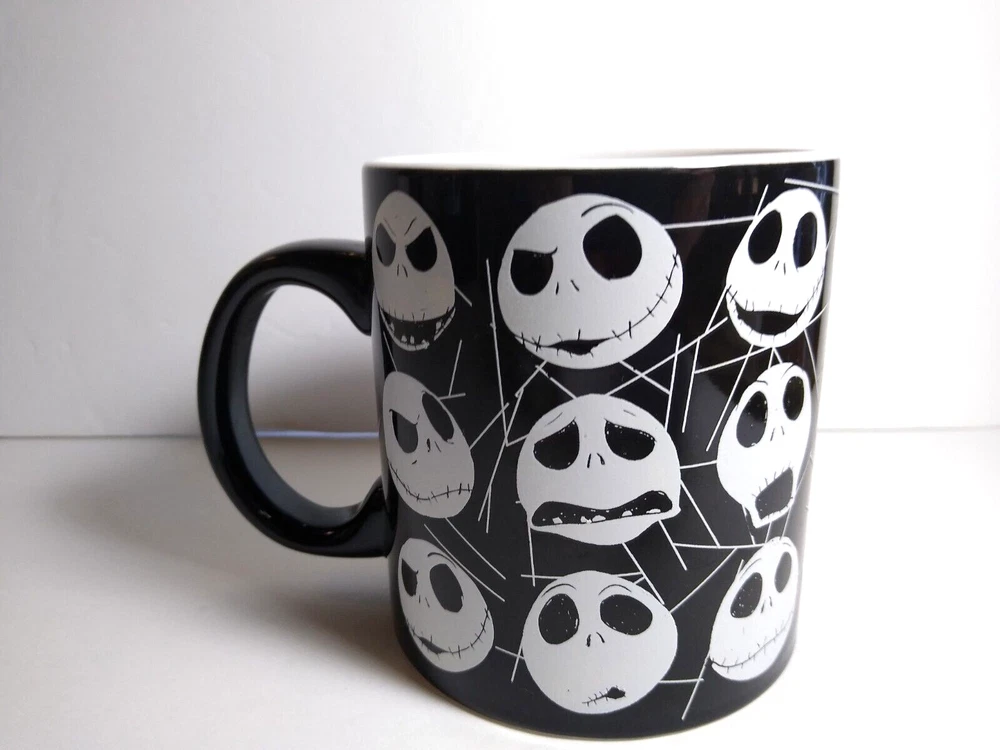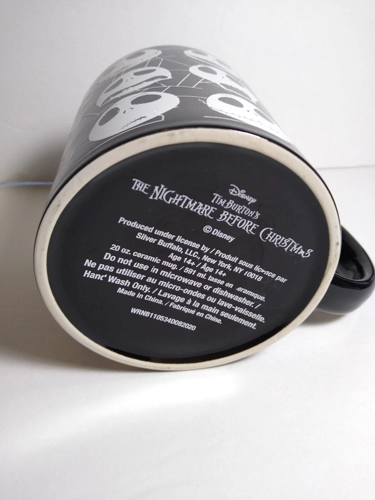 This GLOW IN THE DARK Disney mug features Jack Skellington's many faces, glowing in the dark. The 20-ounce ceramic mug is perfect for any fan of Nightmare Before Christmas. The mug is made by Disney by Silver Buffalo and was released in 2020. It is a great addition to any Disneyana collection or as a standalone piece. The mug is large and features multiple expressions of Jack Skellington, making it a unique and fun piece. Super clean used condition. Size is 4.25" x 5.5".