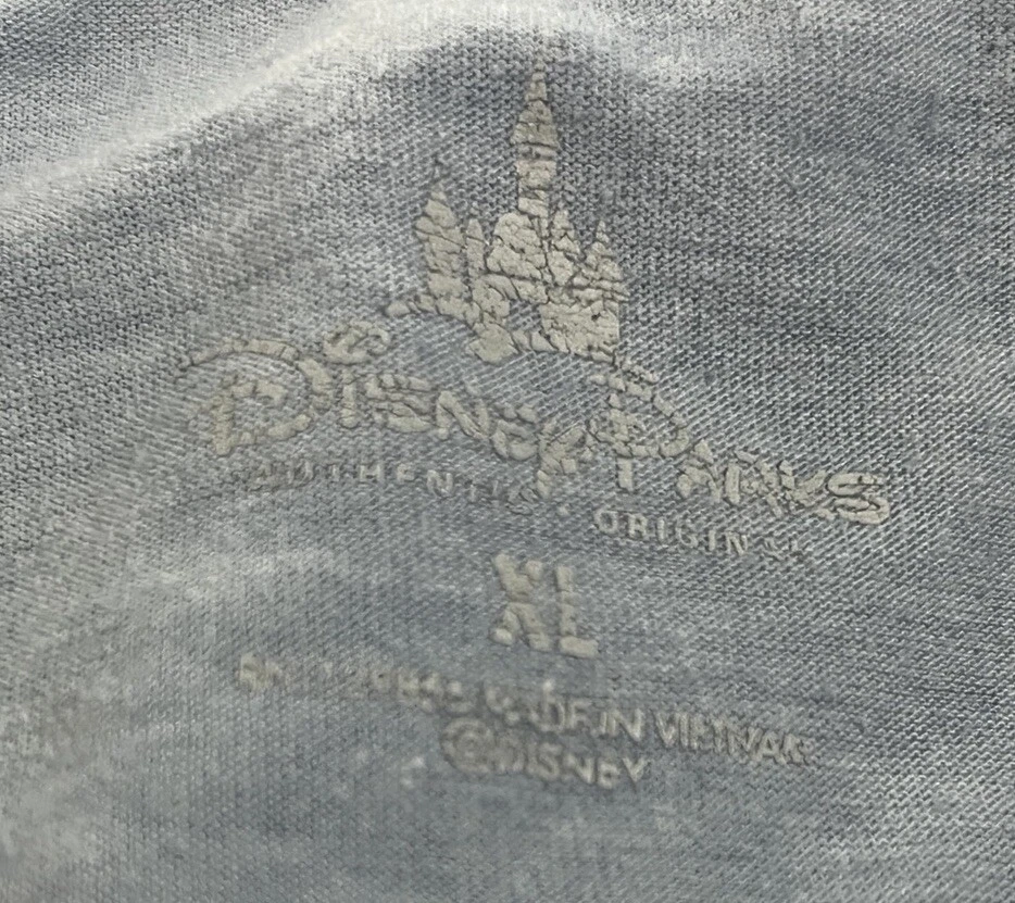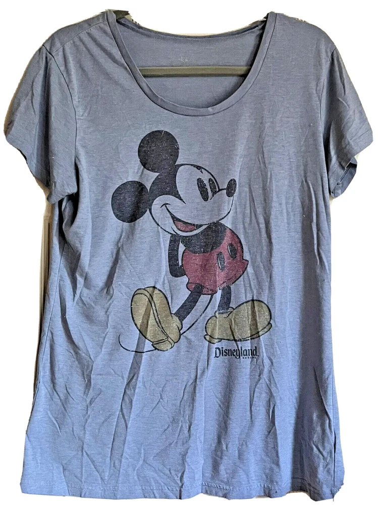 Disney Parks T-shirt Short Sleeve Scoop Neck Vintage Mickey Mouse Graphic Blue Disneyland Top Purchased at Disneyland Park California. Designed as retro vintage with a worn look graphic print. Women's Tag Size Xl Bust 42 Length 26 inches. Breathable stretch polyester cotton. Pre-owned wash wear. Flaking of tagless label.