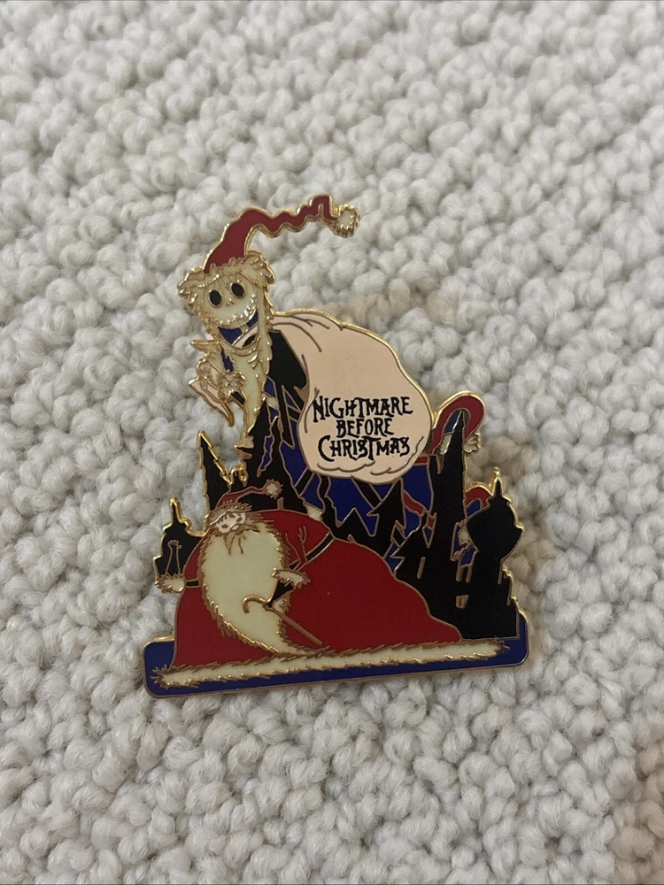 The Disney Pin features Jack Skellington dressed as Santa Claus from the movie "Nightmare Before Christmas" released in 2001. This limited edition pin glows in the dark, adding a unique touch to the design. It is part of the Disney franchise and is a collectible item for fans of the movie and Disney memorabilia collectors. The pin showcases the iconic character in a festive Christmas theme, making it a must-have for fans of the beloved film.