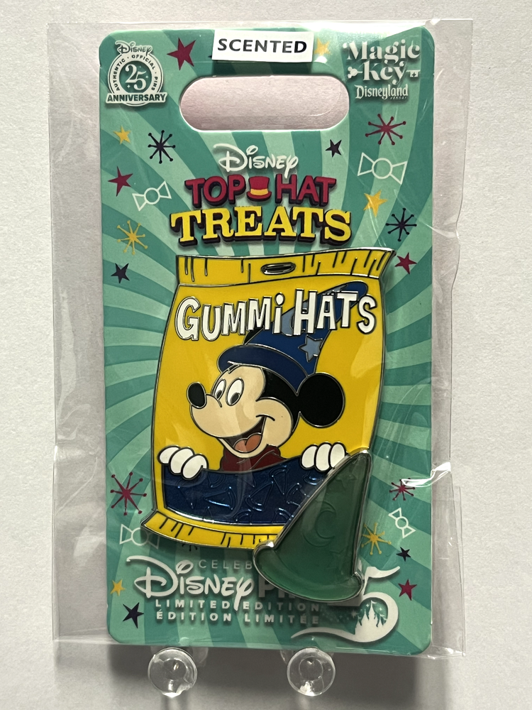 One of four TOP HAT TREATS quarterly pins released at DL in 2025 as Magic Key exclusives. Each GUMMI BAG pin features a different Disney character on the front of a candy bag. In the bottom-right corner of the pin, one of the candy pieces (pin-on-pin element) is sitting in front of the bag. The backer card has the "Celebrating 25 Years of Disney Pins" logo on it. This is the first pin of the series, released in January 2025, and it features GUMMI HATS with SORCERER MICKEY on the front of the bag. The candy piece looks like Mickey's blue sorcerer's hat. Characters in this series include Mickey, Donald, Minnie and Goofy. Thanks to pin pics for the description. Combined shipping discount is: Full shipping cost for the 1st pin and then add $0.50 for each additional pin paid for in a single transaction. If you purchase multiple items, please wait for an invoice with the adjusted shipping cost before checking out. Feel free to ping me and let me know to send you an invoice. Thanks!