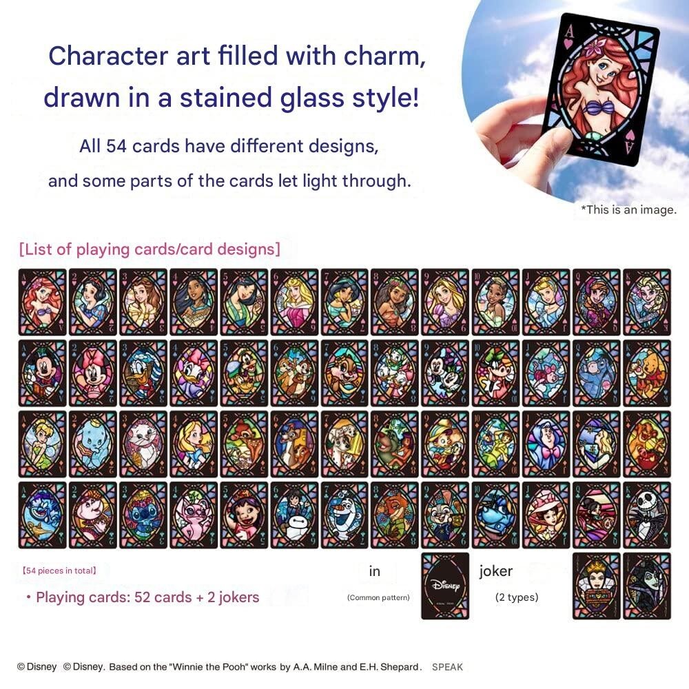 Product Information Product Description Disney Character Stained Glass Transparent Playing Cards 54-Styles from Japan Experience the magic of Disney with this stunning deck of stained-glass-style playing cards that beautifully let light shine through. Featuring vibrant illustrations of beloved Disney characters such as Mickey & Minnie, Winnie the Pooh, and the Disney Princesses, this deck is a must-have for fans of all ages. Each of the 54 cards is uniquely designed with a different illustration, making it as collectible as it is fun to use. Size : Package: Approx. 2.2cm (thick) × 9.2cm (wide) × 10.8cm (high) Cards: Approx. 6.3cm (wide) × 8.8cm (high) Material : PVC Recommended Age : 6 years and up Country of Manufacture : Taiwan Please note that both the packaging and the instructions are in Japanese. Shipping Information All items are shipped from Japan. Handling time usually takes 3-10 business days . Details Shipping Option Courier Tracking Estimated Delivery Time Additional Fees Economy Japan Post (Air) NO 11-23 business days or more None Standard Japan Post (Air) or Speedpak Yes *Excl. AU, NZ, CA 11-23 business days Applies Expedited FedEx or DHL Yes 1-5 business days Applies *may vary for remote areas * For shipments to Australia, Canada, and New Zealand, Economy and Standard shipping options do not include door-to-door tracking. If tracking is required, we recommend selecting the Expedited Shipping option. * For Expedited Shipping, a remote area surcharge may apply based on the courier’s assessment. Unfortunately, this fee can only be confirmed after the order is placed. If applicable, we will notify you prior to shipment. Should you accept the additional fee, we will proceed with shipping promptly. If not, we will be happy to cancel the order upon your request. * Delivery times may vary depending on your country's flight availability and customs clearance procedures. Payment Method We only accept eBay payments. We ship within 3-10 business days after receiving payment (excluding weekends and Japanese holidays). Please update your confirmed shipping address on eBay before ordering, as it cannot be changed after shipment. If reshipment is required, the buyer must pay additional fees. International Buyers Please Note Import duties, taxes, and other charges are not included in the item price or shipping cost. These charges are the buyer's responsibility. Please check with your country's customs office to determine what these additional costs will be prior to bidding or buying. These charges are typically collected by the shipping company or when you pick the item up ? they are not additional shipping charges. We do not mark merchandise values below their actual value or mark items as "gifts" - this is prohibited by US and international regulations. About us We are a Japanese store specializing in handmade Multi-Functional straps and accessories. Each piece is crafted by skilled artisans, blending traditional and modern designs to highlight the unique charm and craftsmanship of Japan. We also offer a selection of practical Japanese products to give you a taste of Japanese culture's elegance and care. Through eBay, we aim to introduce more people to excellent Japanese products. We strive to provide the best shopping experience to ensure you find what you love. If you have any questions or need custom services, please contact us.