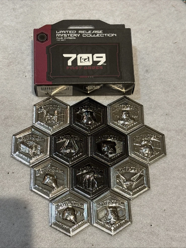 Unfortunately, my ex husband did a very poor job of placing these on the pin board and bent a number of the posts. They are not loose, still sturdy and were displayed on the board. I have reflected this in the price. I have taken pictures of each pin on its side All 4 Le 250 chasers included The product is a complete set of 12 Disney Star Wars First Order 709 pins, featuring Minnie Mouse. It also includes a chaser pin as part of the set. This collectible item is part of the Disney franchise and would be a valuable addition to any Disneyana collection or for fans of Disney characters and movies. The set is sure to be a sought-after item for collectors and enthusiasts of Disney and Star Wars memorabilia.