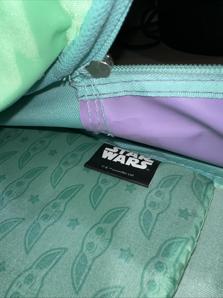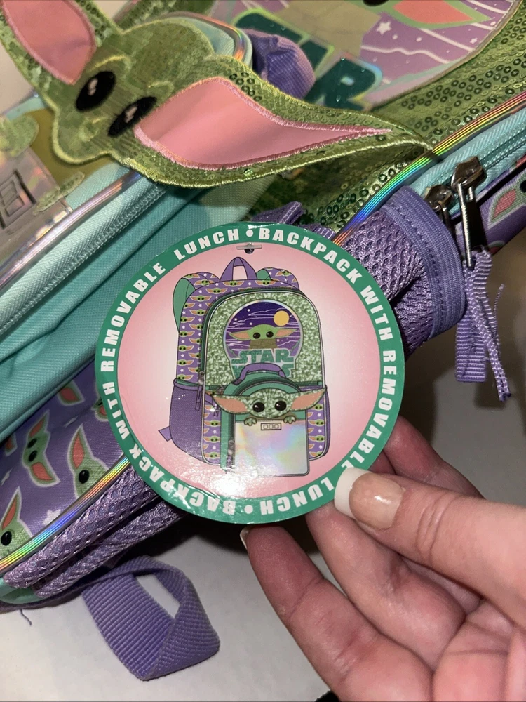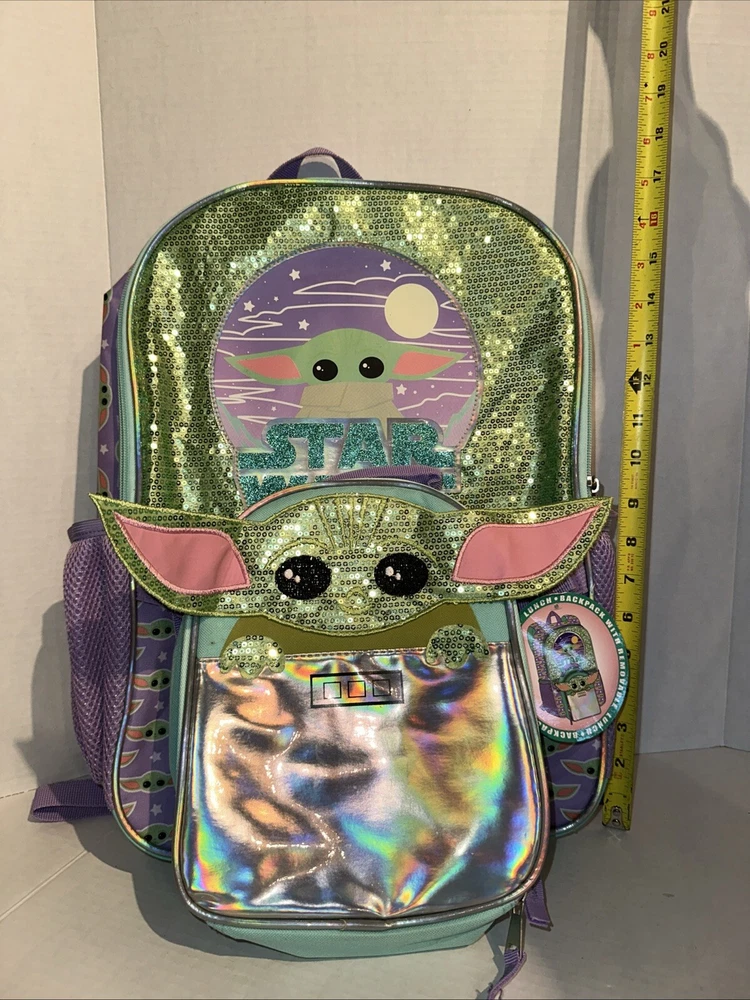 Get your hands on this amazing Disney Star Wars Mandalorian Baby Yoda Backpack With Lunch Bag in Green. The backpack is made of 100% polyester and features a zip closure. It is a large size, measuring 12 inches in width, 18 inches in height, and 4 inches in depth. The backpack is adorned with sequins and has a stars theme, making it perfect for any Star Wars fan. The unisex backpack is perfect for kids, and the backpack is brand new.