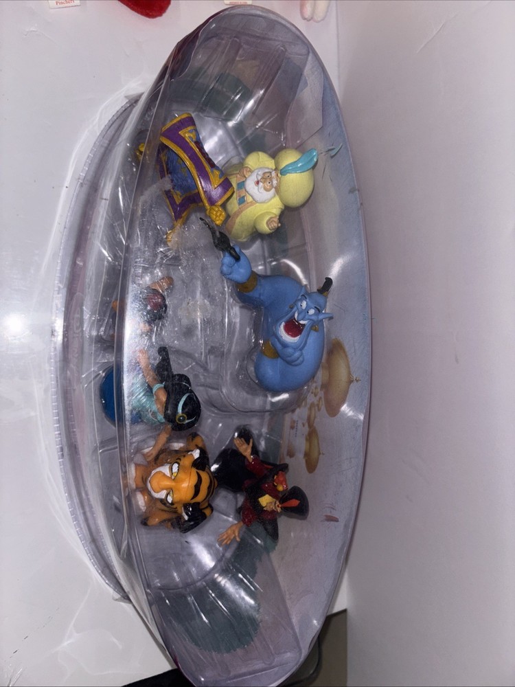 The Disney Store Aladdin Figurine Playset includes 7 figures of popular characters from the Disney Aladdin franchise such as Jasmine, Sultan, Jafar, and the Genie. These collectible figurines are part of the contemporary Disneyana collection, perfect for fans of the beloved Disney movie. Made by Disney, this playset allows fans to bring their favorite characters to life through detailed and authentic figurine representations.