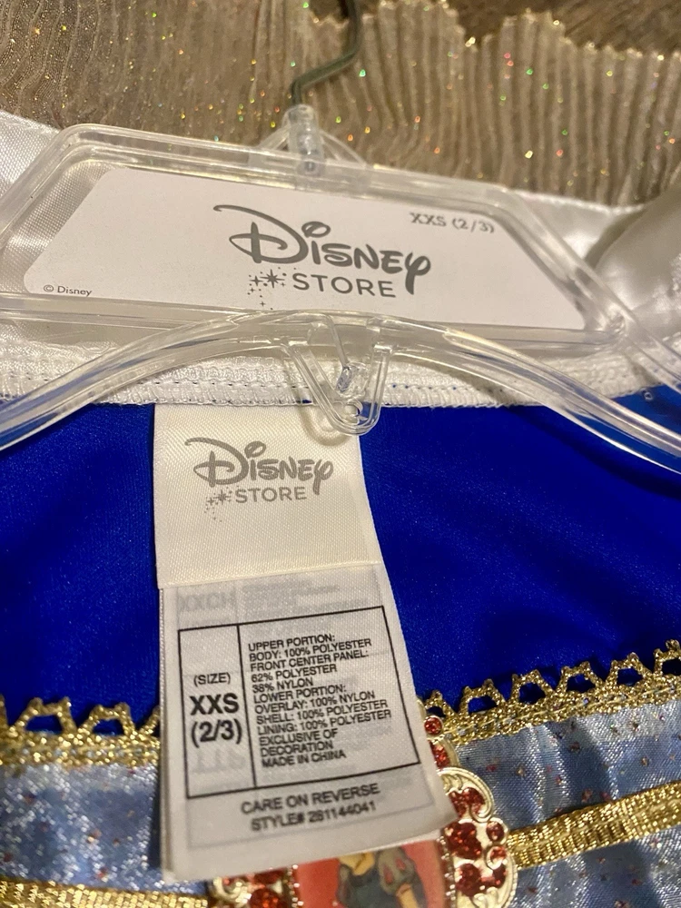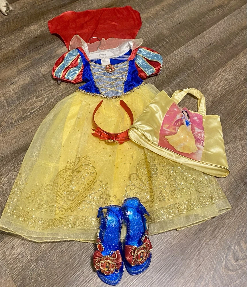 The Disney Store Snow White Princess Dress is a charming outfit for young children, featuring a multi-color design with styling elements inspired by the beloved Princess Snow White. Made of polyester material, the dress has a stretchy elastic quality for comfort and ease of movement. This Princess-themed set also includes a matching headband, shoes, and purse, adding a whimsical and complete touch to the overall ensemble. Made in China, this Disney-themed outfit is perfect for young fans looking to dress up like their favorite princess.