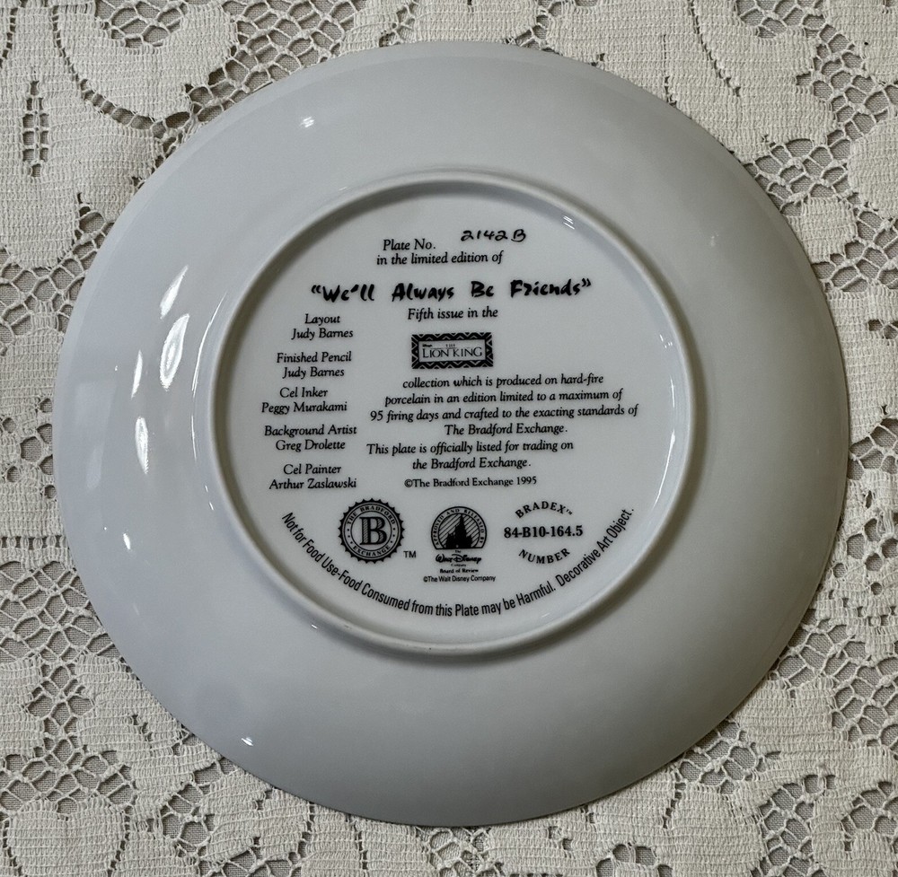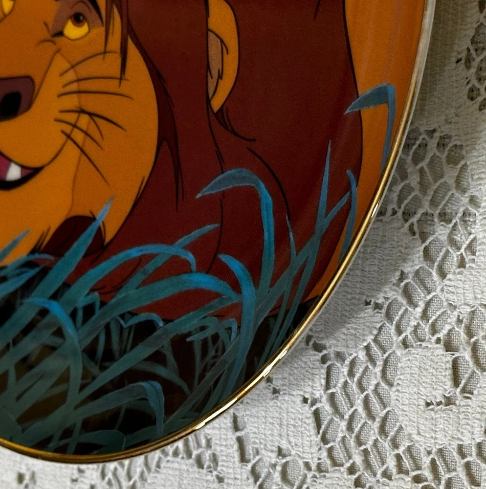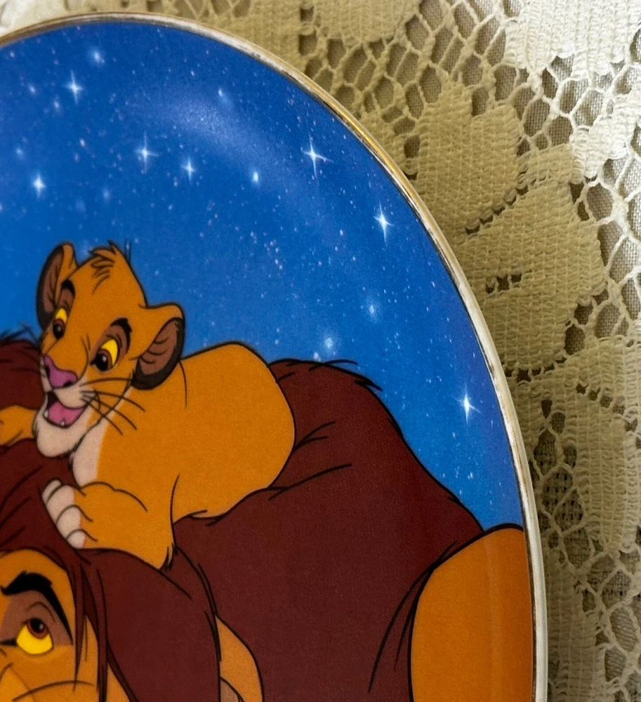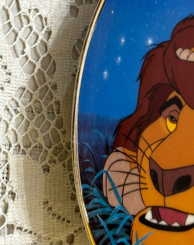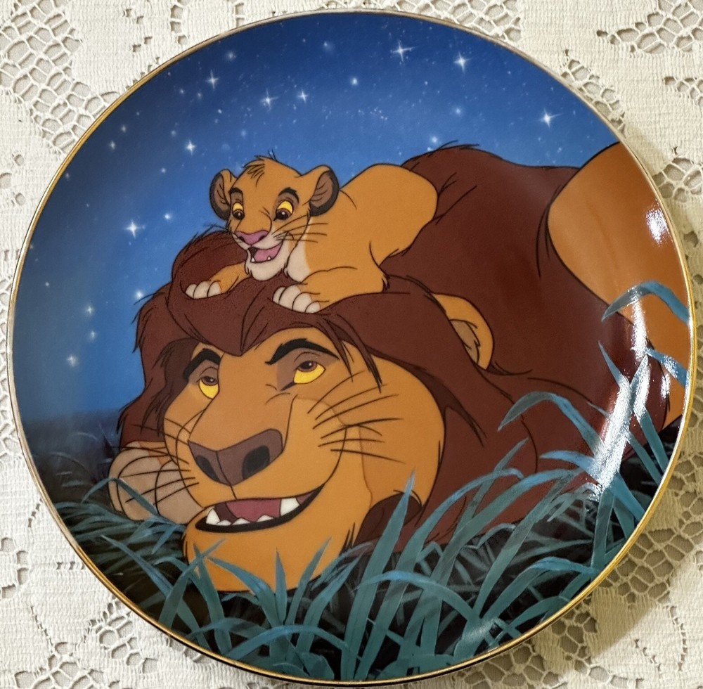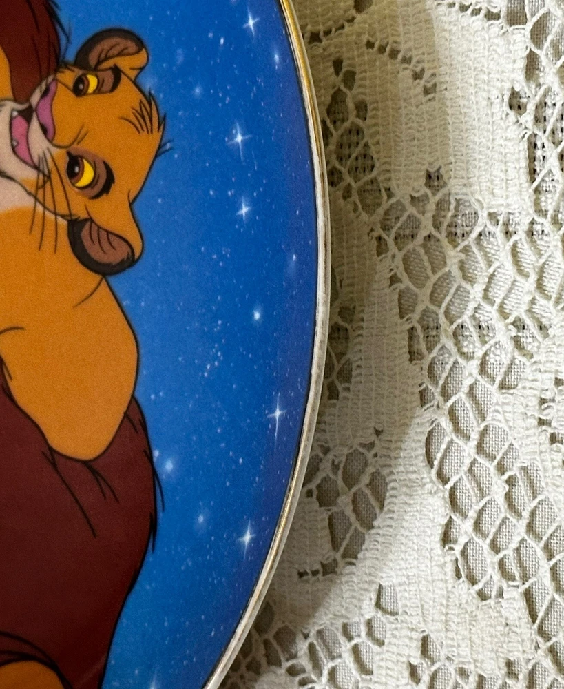 This vibrant art collector plate shows Mufasa and Simba playing in the grass under the beautiful stars! This art piece is from 1995 Bradford exchange and Walt Disney World. It’s in great and used condition. The only wear is on the gold rim of the plate as shown in the photos. Please review all pictures and ask any questions as this is sold as is. Thank you for your time! :)
