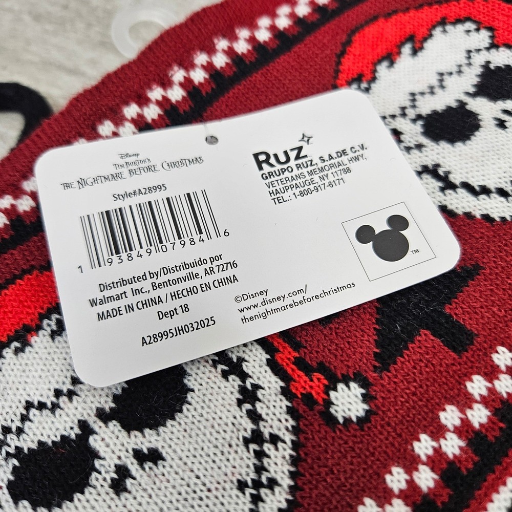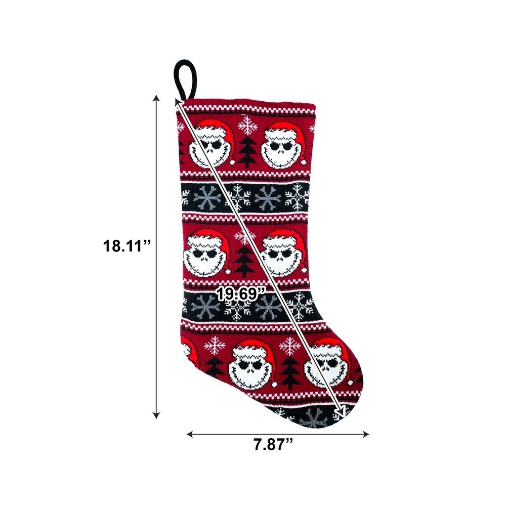 Embrace the spooky charm of Halloween Town with this festive stocking, bringing a touch of Tim Burton's iconic "The Nightmare Before Christmas" to your holiday decor. Adorned with a repeating pattern of Jack Skellington sporting a Santa hat, interspersed with classic snowflakes and pine trees, this stocking is a playful nod to the beloved film. The rich red background, accented with black and white knit details, creates a visually striking and festive piece perfect for hanging by the fireplace. Imagine the delight of discovering your holiday treats tucked inside this uniquely themed stocking, adding a memorable touch to Christmas morning. Ideal for fans of the movie, this stocking is perfect for adding a whimsical and slightly gothic flair to your Christmas celebrations or as a special gift for a fellow enthusiast. Measurements: • Length: 18.11 in • Width at opening: 7.87 in • Width at foot: 19.69 in Type: Christmas Stocking Occasion: Christmas Set Includes: Christmas Stocking Department: Adults Material: Fabric, Cloth, Polyester Character: Jack Skellington Number of Items: 1 Character Family: The Nightmare Before Christmas Theme: Holiday Shape: Tree Pattern: Striped Item Length: 18 in Item Height: 18 in Keywords: Jack Skellington, Christmas stocking, Tim Burton, Nightmare Before Christmas, Holiday decor, Festive knit, Santa hat, Snowflake pattern, Gift idea, Disney fan, Gothic Christmas, Halloween Town, Winter holidays