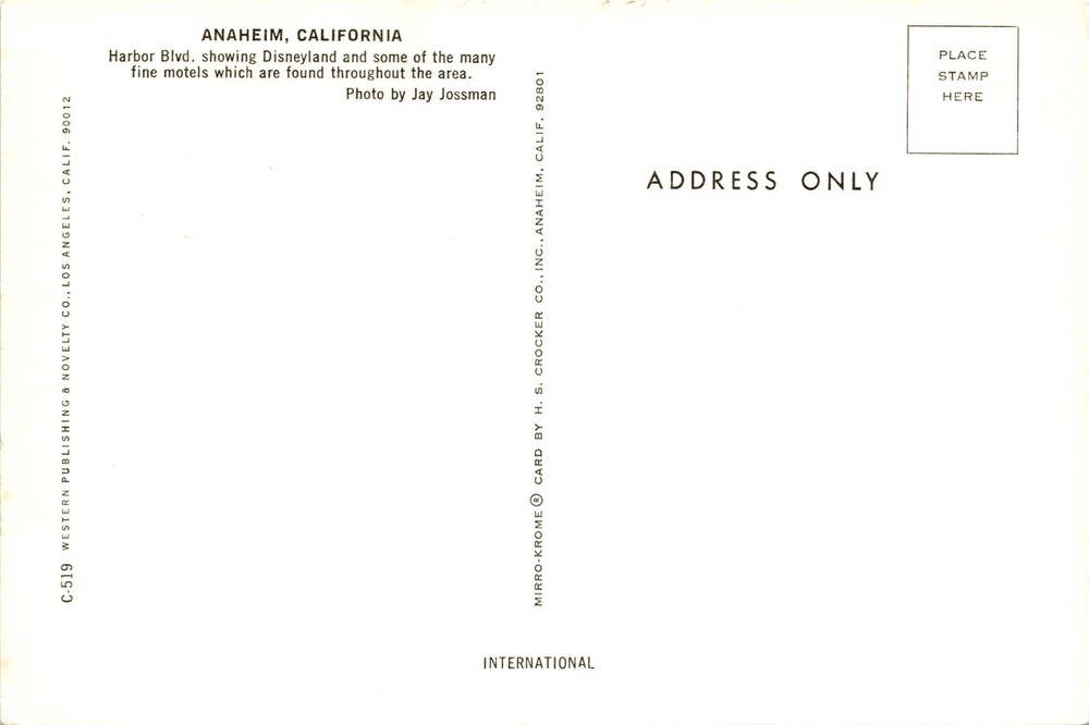 MAKE AN OFFER. THE MORE YOU BUY THE BETTER DEAL I WILL ACCEPT The front of the postcard features a photo of Disneyland in Anaheim, California, with some of the surrounding motels visible. Disneyland is a famous theme park and resort created by Walt Disney, which opened in 1955. It is known for its various themed lands, attractions, and characters from Disney movies.