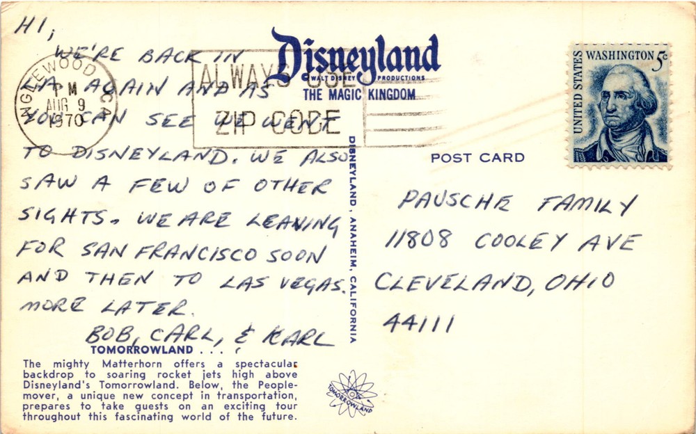MAKE AN OFFER. THE MORE YOU BUY THE BETTER DEAL I WILL ACCEPT The postcard is from a group of people named Bob, Carl, and Karl who are visiting Disneyland in Anaheim, California. They mention being in LA again on August 9th and seeing the Magic Kingdom at Disneyland. They plan to leave for San Francisco and then head to Las Vegas.