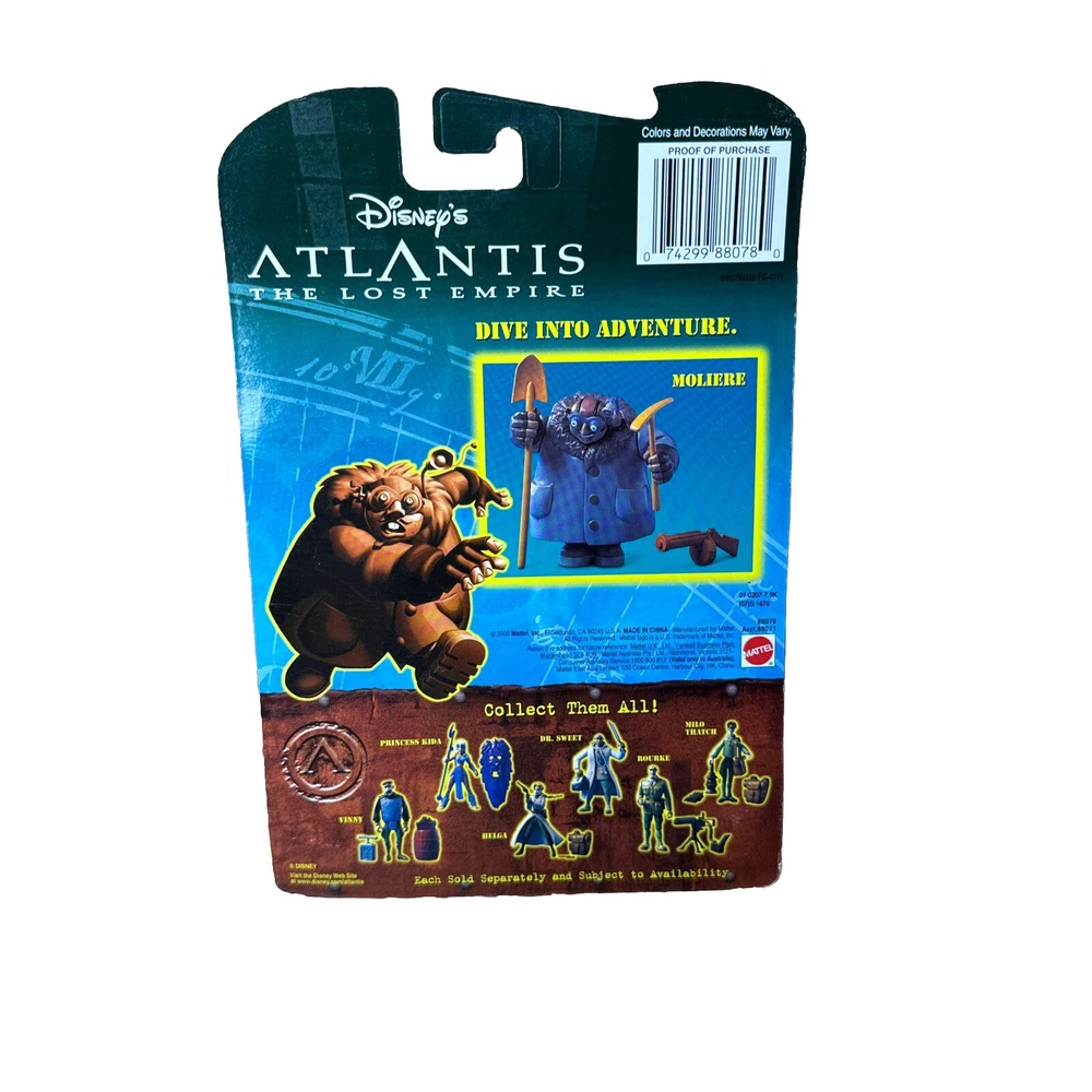 This Disney's Atlantis The Lost Empire Moliere Action Figure is a must-have for any fan of the movie. With its Power-Sparking Drill, this original Mattel figure brings to life the beloved character from the 2001 movie. The figure is in great shape and ready for display or play. The Moliere figure is part of the Disney franchise and is an original licensed reproduction. It is perfect for collectors or anyone who loves action figures. This particular figure was manufactured in the 2000s and is a great addition to any collection. Get this piece of movie memorabilia today!