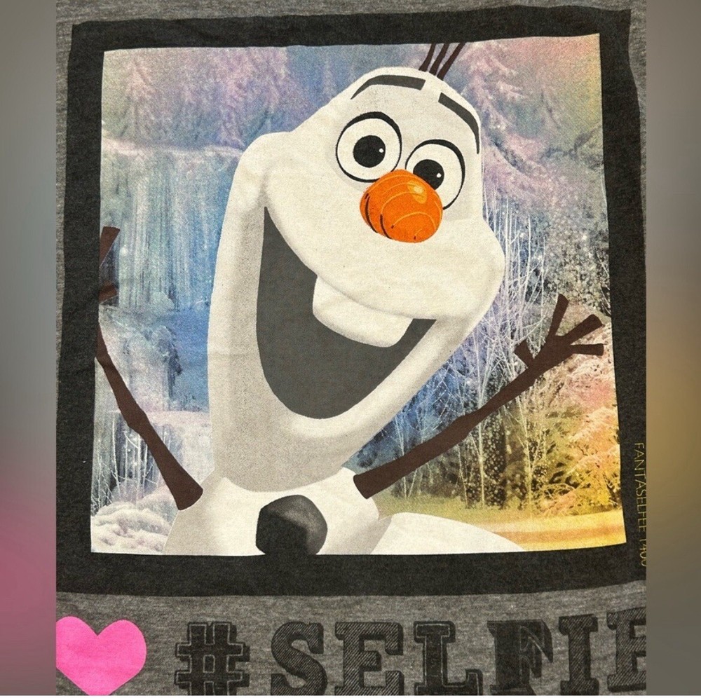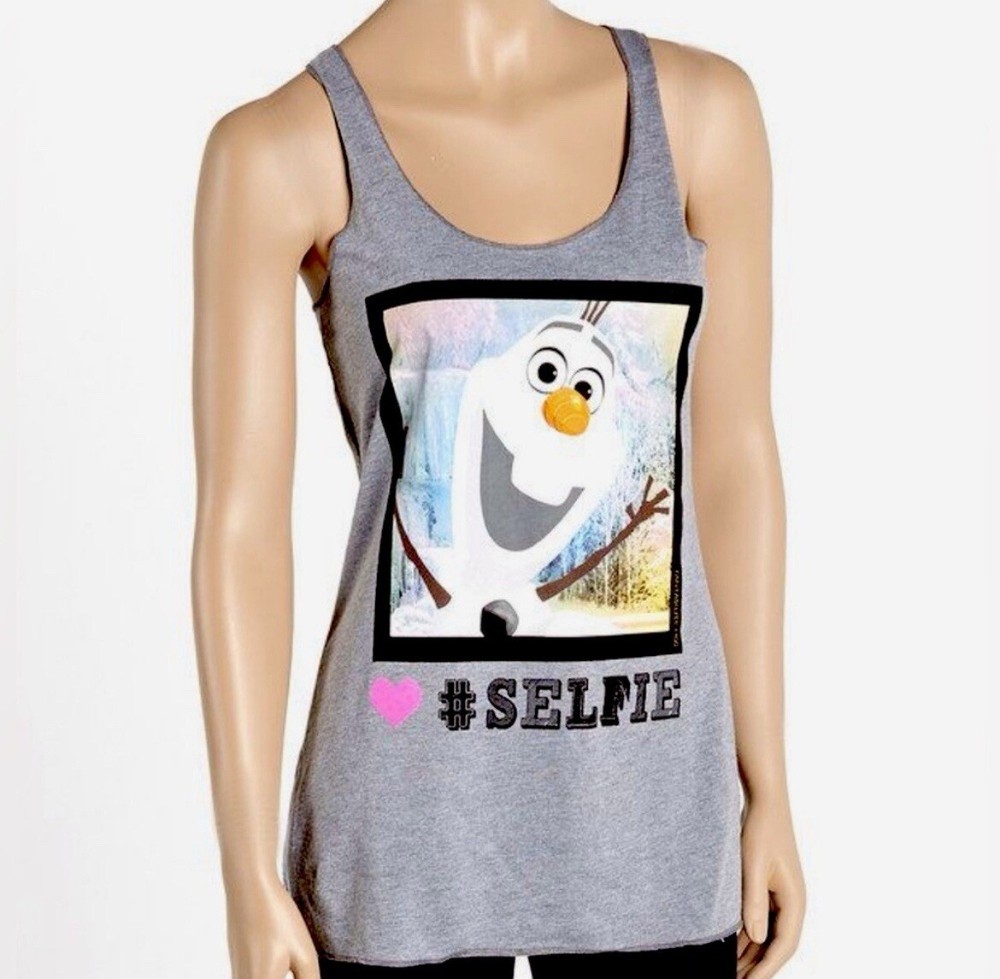 This Disney Frozen Olaf Tank Top in size S features a solid gray color with a scoop neckline and a racerback strap. Made from a cotton blend knit fabric, it is machine washable and easy to care for. This casual sleeveless top is lightweight and suitable for summer, fall, and spring seasons. The front has a fun "#selfie" design related to the beloved character Olaf.