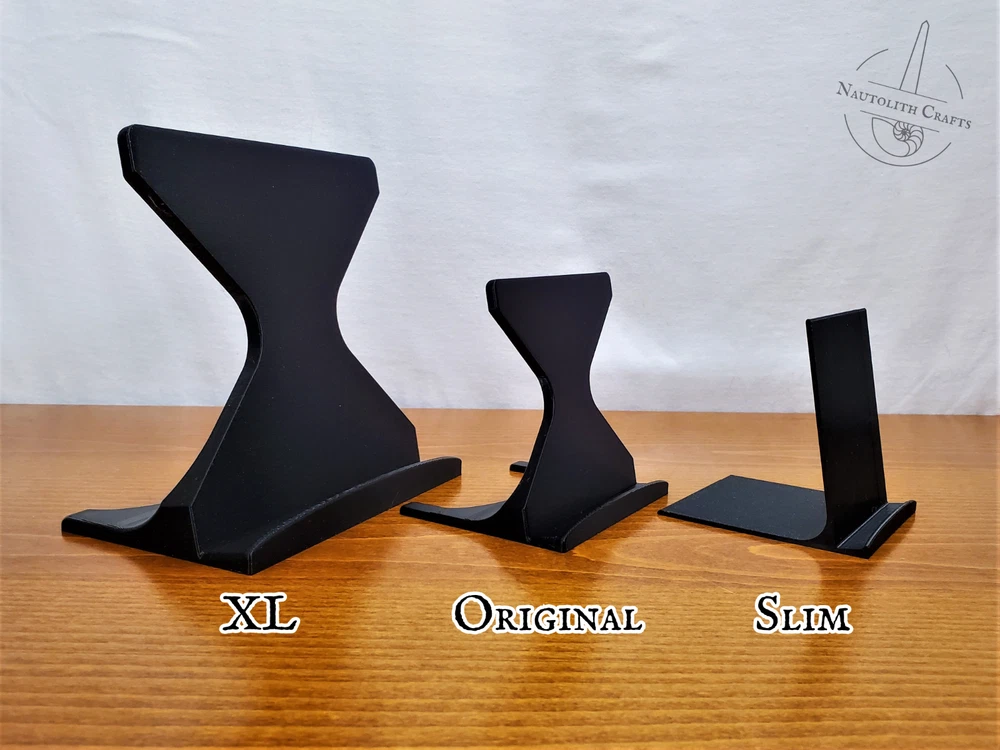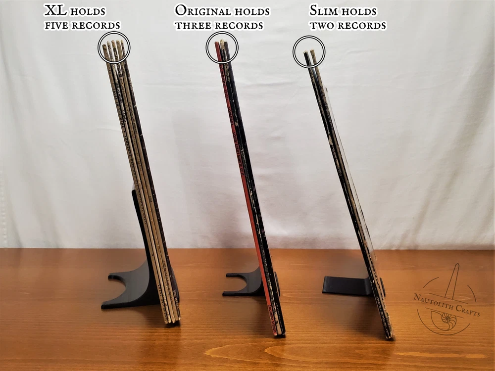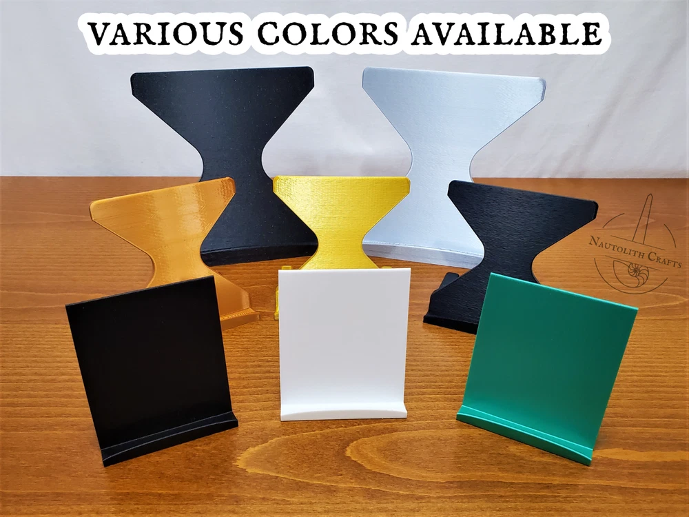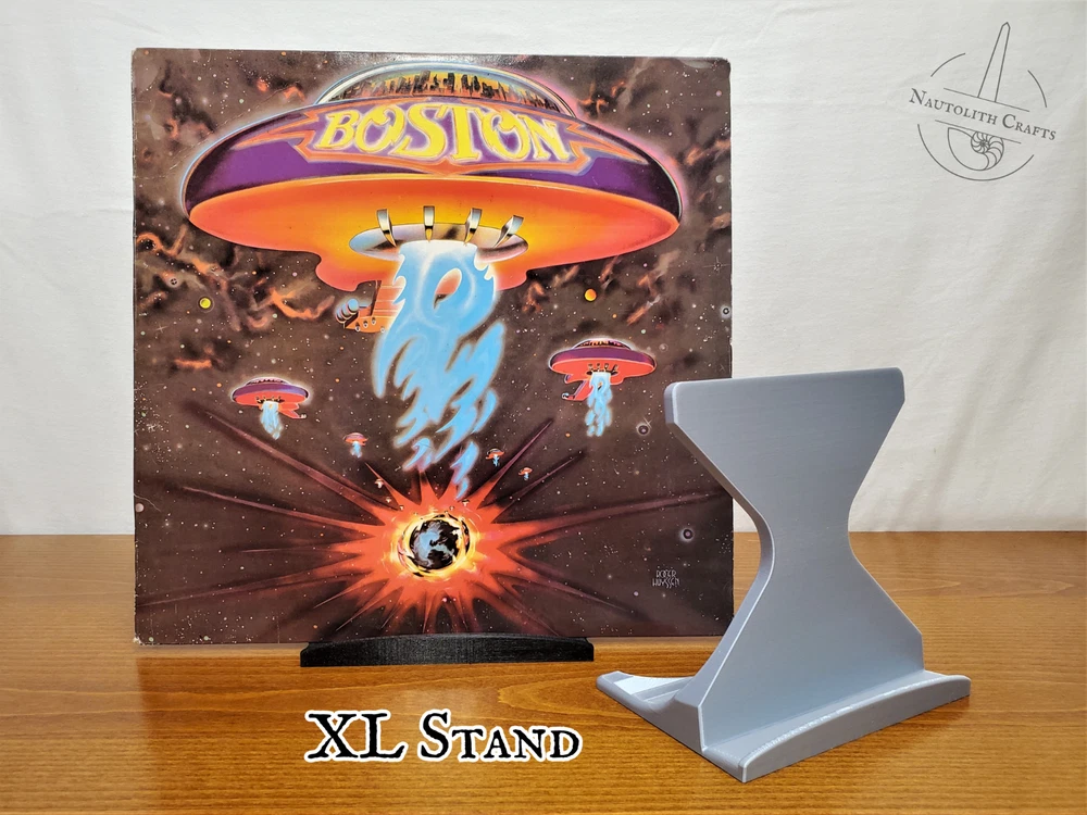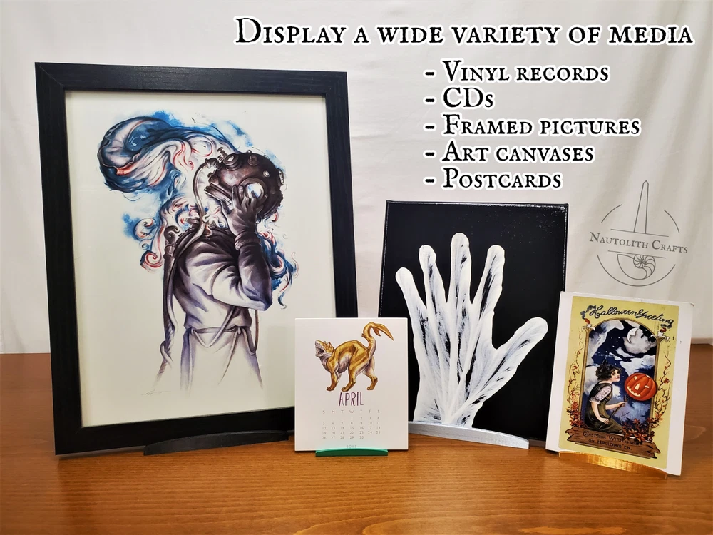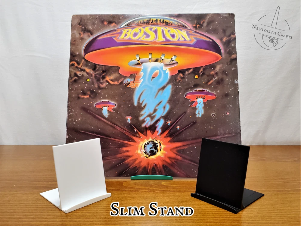 Put your favorite pieces of music and art on display with these versatile tabletop stands. Whether you're showing off album art or your comic book collection, these sturdy stands are up to the task. Choose from three different stand sizes to match your preferred balance of strength and sleekness, then choose from a wide array of colors to match your style. Discounted bundles available! ---Dimensions--- Slim Stand Height: 3.4in (86mm) Width: 3in (75mm) Depth: 3.3in (85mm) Holds items up to 3/8in (11mm) thick. Original Stand Height: 4in (100mm) Width: 4in (100mm) Depth: 3.2in (80mm) Holds items up to 1/2in (13mm) thick. XL Stand Height: 6in (150mm) Width: 6in (150mm) Depth: 4in (100mm) Holds items up to 3/4in (19mm) thick. Check out my shop for more cool display solutions. These stands are 3D printed using PLA filament. Feel free to message me if you have any questions! I ship using reused and recyclable shipping supplies when able to minimize my environmental impact.