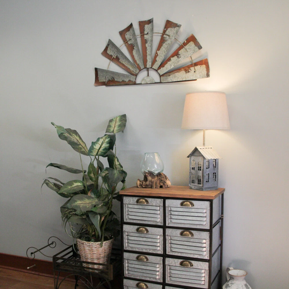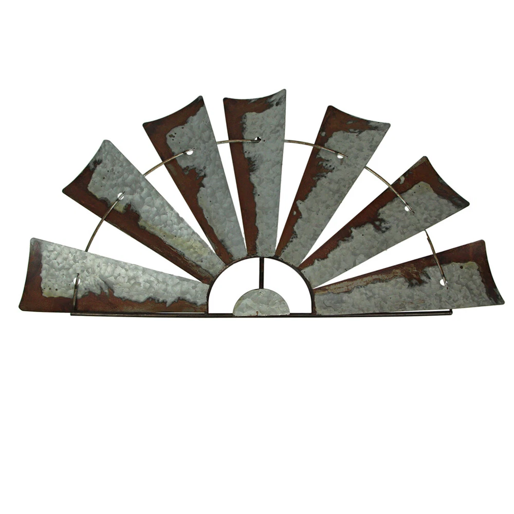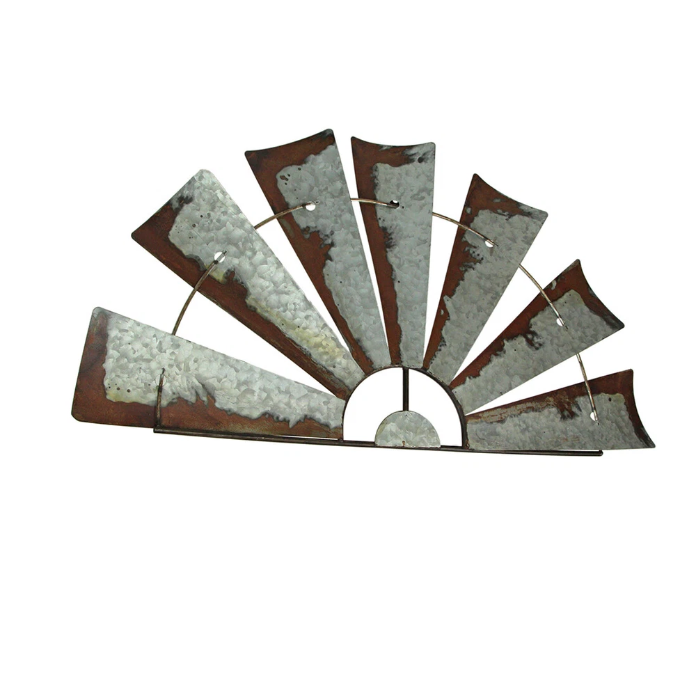 Overall Size - Embracing dimensions of 36 inches in length, 0.25 inches in width, and 17.25 inches in height, this windmill wall sculpture boasts an impressive presence, adding depth and character to your space. Creative Design - Meticulously crafted from galvanized metal, this artwork features a distinctive and stylish half-windmill design. Its unique structure showcases the creativity and craftsmanship that adorn your walls. Rustic Decoration - Sporting a distressed silver/grey vintage finish, complemented by faux rust accents, this wall piece exudes rustic charm. The simple metal wire frame adds to its authenticity, enhancing the weathered aesthetic. Our eBay Store About Us Add to Favorite Sellers Galvanized Grey Metal Half-Windmill Wall Sculpture - Large 36-Inch Rustic Art Piece - Easy Installation - Perfect for Country Farmhouse Themed Decor Overall Size - Embracing dimensions of 36 inches in length, 0.25 inches in width, and 17.25 inches in height, this windmill wall sculpture boasts an impressive presence, adding depth and character to your space. Creative Design - Meticulously crafted from galvanized metal, this artwork features a distinctive and stylish half-windmill design. Its unique structure showcases the creativity and craftsmanship that adorn your walls. Rustic Decoration - Sporting a distressed silver/grey vintage finish, complemented by faux rust accents, this wall piece exudes rustic charm. The simple metal wire frame adds to its authenticity, enhancing the weathered aesthetic. Western Decor - Perfectly suited for Western-inspired themes, this sculpture makes a striking statement. Ideal for adorning spaces above the mantel, window, door, or artwork, it effortlessly captures the essence of rustic elegance. Home Style - Tailored for rustic, country, or farmhouse-inspired interiors, this windmill sculpture finds its home in your living room, kitchen, or bedroom. Its timeless appeal seamlessly blends with your decor, enhancing the ambiance of your space. Transform your living space with the timeless elegance of this farmhouse-inspired rustic wall art piece, reminiscent of classic farm landmarks. Crafted with care, this 36-inch long, 17.25-inch high decorative windmill sculpture is the epitome of rustic charm. Its galvanized metal construction boasts a distressed silver finish, accentuated by faux rust detailing along the edges, creating a weathered vintage appearance that exudes character. Whether it graces your mantel, hangs above a door, window, or artwork, this piece becomes an eye-catching focal point, elevating your home decor to new heights. The intricate design captures the essence of a bygone era, evoking the charm of rural life. Its versatility allows for creative styling embellish it with delicate string lights and vibrant greenery for a touch of enchantment, or let it stand alone as a statement piece. This decorative windmill invites you to infuse your personal style, transforming any room into a haven of warmth and sophistication. Its small circle design, reminiscent of traditional farm windmills, adds a touch of nostalgia to your space. Whether your decor leans towards rustic, vintage, or modern farmhouse aesthetics, this windmill sculpture effortlessly complements any style, enhancing the ambiance of your home with its captivating allure. Embrace the rustic sophistication of this piece, and let it become a cherished addition to your home, reflecting your unique style and taste. Product Details Color Silver Height 18 Length 36 Weight 2.55 LB