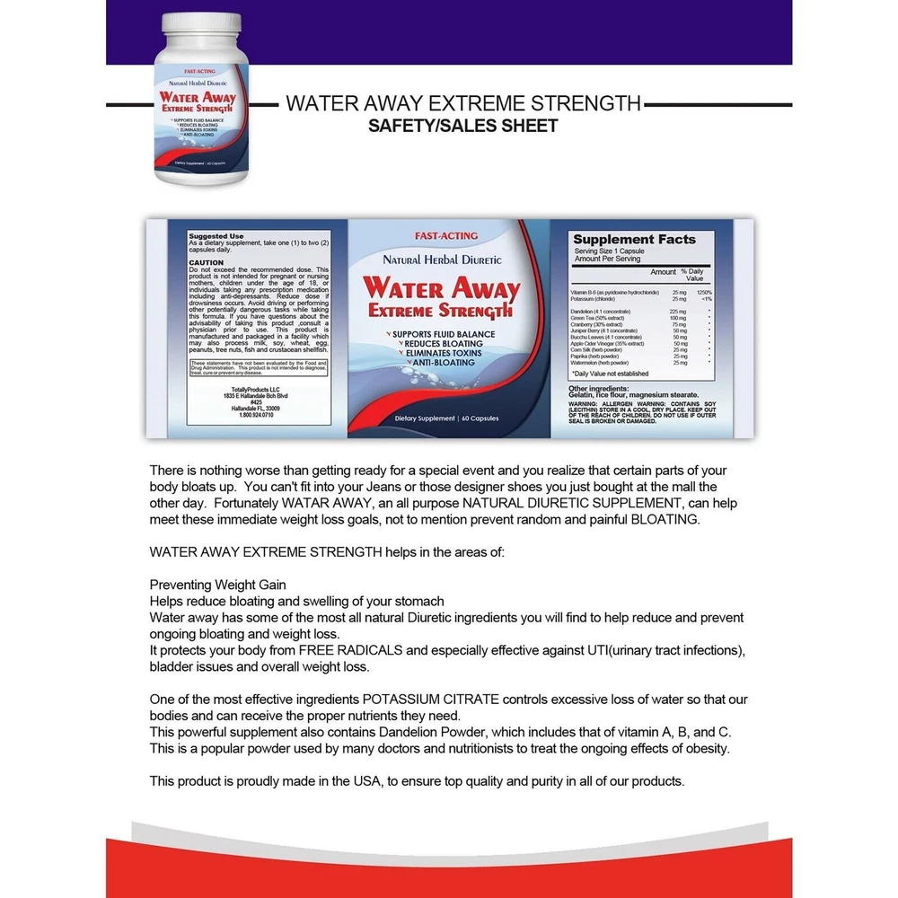 100% Natural Premium Quality Fast Shipping Diuretic Water Away Pills 700mg Acai Slim Berry Weight Loss Dietary Supplement Special 1.) Diuretic Water Away Pills 700mg Weight Loss Blend of Minerals Supplement Water Away is an herbal remedy that uses time-tested ingredients to remove excess water weight, bloating and swelling without unnatural side effects. An all-natural herbal nutrient blend to help promote a balanced level of fluids in the body, along with a healthy diet & exercise program, Water Away will help you feel your best. High potency Vitamin B6 helps replenish the normal loss of this water-soluble vitamin when fluids are expelled from the body. Because Water Away is made with potassium and dandelion root (known to be a source of potassium itself) to replace what is lost through urination, there is no need to take additional supplements. 2.) Ultimate Organic Acai Slim Berry Weight Loss Belly Fat Burn Dietary Supplement Maintain a normal metabolism and energy production when you take these Acai Slim capsules, which contain acai berries from the Amazon forest. The acai berry will increase energy and stamina levels, and help support healthy cardiovascular and digestive health because of its amazing combination of healthy fats, phytosterols, dietary fiber, omegas & vitamins. Count: 60 capsules Medicine Form: Caplets Suitable for Vegetarians and Vegans. OFFER See our other items Payment Shipping We accept payment by any of the following methods: PayPal Please pay as soon as possible after winning an auction, as that will allow us to post your item to you sooner! We offer FREE standard shipping on all orders! Your order will be shipped within 1 working day of receiving payment (Monday-Friday) and you should expect to receive it in 1 to 5 business after initial shipment date if shipped with USPS First Class Mail. In the very unlikely event that your item is lost or damaged during shipping, then WE are responsible and will issue either a full refund or replacement. Returns If you are not 100% satisfied with your purchase, you can return the product and get a full refund or exchange the product for another one, be it similar or not. You can return a product for up to 30 days from the date you purchased it. Any product you return must be in the same condition you received it and in the original packaging. Please keep the receipt. 100% Natural Premium Quality Fast Shipping 1.) Diuretic Water Away Pills 700mg Weight Loss Blend of Minerals Supplement Water Away is an herbal remedy that uses time-tested ingredients to remove excess water weight, bloating and swelling without unnatural side effects. An all-natural herbal nutrient blend to help promote a balanced level of fluids in the body, along with a healthy diet & exercise program, Water Away will help you feel your best. High potency Vitamin B6 helps replenish the normal loss of this water-soluble vitamin when fluids are expelled from the body. Because Water Away is made with potassium and dandelion root (known to be a source of potassium itself) to replace what is lost through urination, there is no need to take additional supplements. 2.) Ultimate Organic Acai Slim Berry Weight Loss Belly Fat Burn Dietary Supplement Maintain a normal metabolism and energy production when you take these Acai Slim capsules, which contain acai berries from the Amazon forest. The acai berry will increase energy and stamina levels, and help support healthy cardiovascular and digestive health because of its amazing combination of healthy fats, phytosterols, dietary fiber, omegas & vitamins. Count: 60 capsules Medicine Form: Caplets Suitable for Vegetarians and Vegans. Diuretic Water Away Pills 700mg Acai Slim Berry Weight Loss Dietary Supplement 100% Natural Premium Quality Fast Shipping Special OFFER See our other items 1.) Diuretic Water Away Pills 700mg Weight Loss Blend of Minerals Supplement Water Away is an herbal remedy that uses time-tested ingredients to remove excess water weight, bloating and swelling without unnatural side effects. An all-natural herbal nutrient blend to help promote a balanced level of fluids in the body, along with a healthy diet & exercise program, Water Away will help you feel your best. High potency Vitamin B6 helps replenish the normal loss of this water-soluble vitamin when fluids are expelled from the body. Because Water Away is made with potassium and dandelion root (known to be a source of potassium itself) to replace what is lost through urination, there is no need to take additional supplements. 2.) Ultimate Organic Acai Slim Berry Weight Loss Belly Fat Burn Dietary Supplement Maintain a normal metabolism and energy production when you take these Acai Slim capsules, which contain acai berries from the Amazon forest. The acai berry will increase energy and stamina levels, and help support healthy cardiovascular and digestive health because of its amazing combination of healthy fats, phytosterols, dietary fiber, omegas & vitamins. Count: 60 capsules Medicine Form: Caplets Suitable for Vegetarians and Vegans. Payment We accept payment by any of the following methods: PayPal Please pay as soon as possible after winning an auction, as that will allow us to post your item to you sooner! Shipping We offer FREE standard shipping on all orders! Your order will be shipped within 1 working day of receiving payment (Monday-Friday) and you should expect to receive it in 1 to 5 business after initial shipment date if shipped with USPS First Class Mail. In the very unlikely event that your item is lost or damaged during shipping, then WE are responsible and will issue either a full refund or replacement. Returns If you are not 100% satisfied with your purchase, you can return the product and get a full refund or exchange the product for another one, be it similar or not. You can return a product for up to 30 days from the date you purchased it. Any product you return must be in the same condition you received it and in the original p