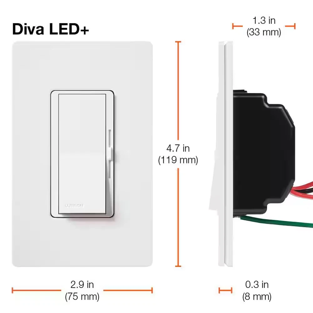 Fast Shipping On All Items 30 Days Money Guarantee Customer Support Excellent Service 100% Satisfaction Satisfaction Guaranteed Diva LED+ Dimmer Switch for Dimmable LED Bulbs, 150-Watt/Single-Pole or 3-Way, White (DVCL-153PR-3-WH) (3-Pack) Specification Amperage (A) 1.25 A Circuit Connection 3-Way,Single Pole Color Family White Color/Finish White Compatible Bulb Type CFL,Halogen,Incandescent,LED Control Function Dimmer Control Style Rocker Dimmable Capability Dimmable Durability Not Applicable Electrical Features Programmable Features Programmable Finish Type Gloss Indoor/Outdoor Indoor Material Resin Mounting Type In-Wall Number of Switches Three Package Quantity 3 Returnable 90-Day Voltage (V) 120 V Wall Plate Included No Wall Plate Certifications and Listings UL Listed Manufacturer Warranty 10 Year with product registration Product Depth (in) 1.25 in Product Height (in) 4 in Product Width (in) 2.25 in 2.25 inches x 1.25 inches x 4.0 inches. Item Description Dimmer switch provides best dimming performance for LED bulbs Rocker paddle to turn lights on/off; discreet slider to dim Works in a 3-way switch or single pole application The Diva LED+ dimmer switch provides optimal dimming performance of LED bulbs. This dimmer switch works with up to 150-Watt of dimmable LED/CFL or 600-Watt of incandescent/halogen, allowing you to control multiple bulb types on the same circuit. It is designed to control a broad range of dimmable LED and CFL bulbs from a variety of brands including Philips, Cree, GE, EcoSmart and Lighting Science. The Diva dimmer switch features a paddle switch to turn your lights off or on returning the lights to your favorite level. This dimmer switch also features a discreet slide control next to the switch, allowing you to adjust the lights for any activity. Coordinating Claro wall plate sold separately. About us We offer the best prices around on high quality products. Our E-store includes media such as books, movies, music and games while offering electronics, toys, sporting apparel, clothing, tools, general home, garden items and more. Shipping We are always working hard to ensure your package arrives as soon as possible. Please understand that some factors like weather, high postal traffic, and the performance of shipping companies are outside of our control. We offer free shipping to the lower 48 states and ship within 2-3 business days of payment, usually sooner. We do not accept P.O. Boxes. Please provide a physical address. For shipping outside of the continental USA, we only use eBay's Global Shipping Program.The item is shipped to KY and then sent to the rest of the world. International customers are responsible for all duties and taxes. Continue to check out to calculate costs for shipping the item to your country. Messages regarding eBay's Global Shipping Program MUST be directed at eBay EXCLUSIVELY. Returns We offer a 30-Day Return Policy on items in which you are not completely satisfied with. You have the option of a full-refund or an exchange of the item. No returns are available on items shipped outside of the USA Satisfaction We try over very best to make sure every customer is completely satisfied. If there's a problem, message us! We're happy to help. Payment Options Shop With Confidence