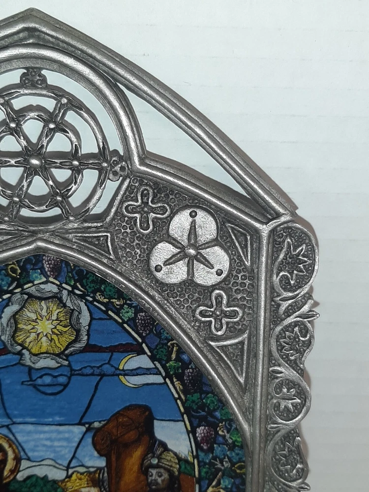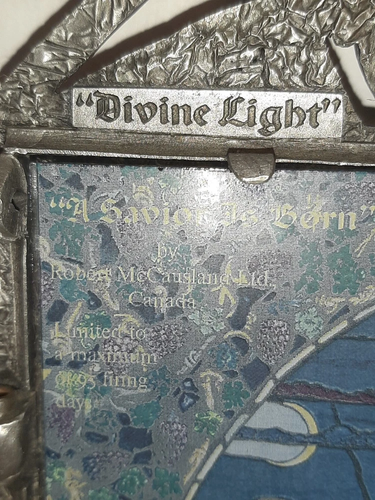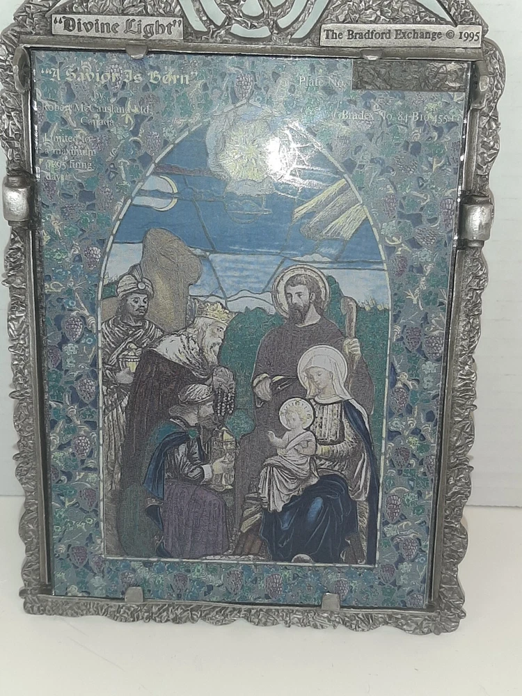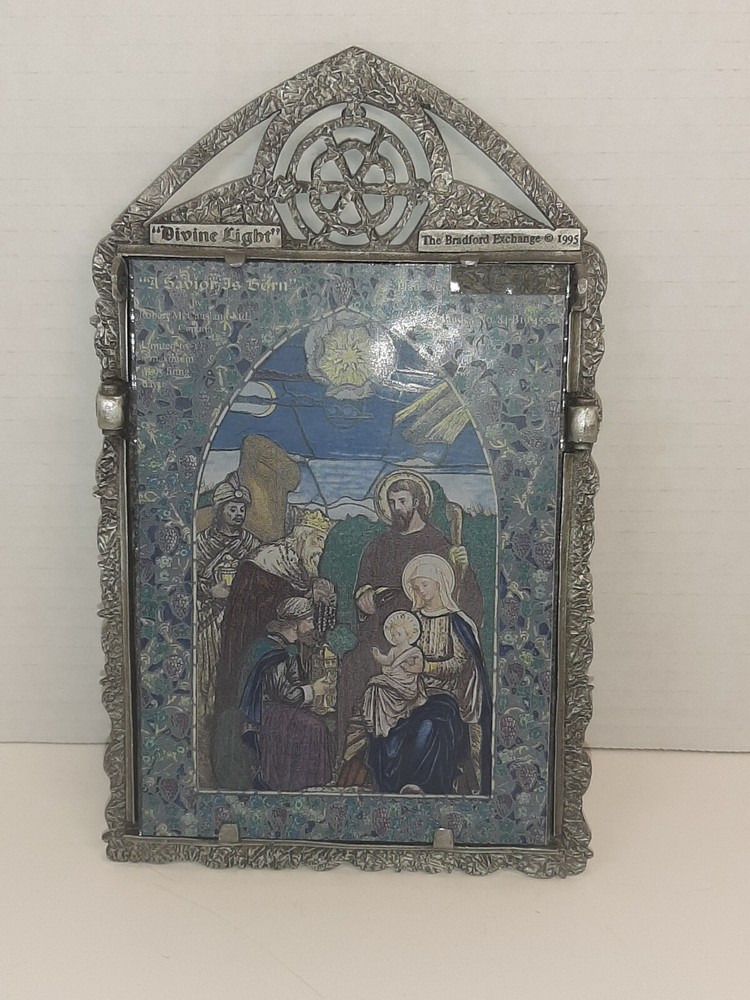 Divine Light The Bradford Exchange 1995 A Savior is Born Stain Glass Pewter READ In good pre-owned condition may show signs of wear from use/handling/storage/display. Please view all pics for condition/details/flaws/issues. SOLD AS IS There was supposed to be a chain off the back for hanging it is missing and broken off there is discoloration, surface scratches, dirt/debris to item. There is/maybe marks/spots/dirt/debris please see photos 1-14, there is/maybe paint loss/sticker loss please see photos 1-14, there is lite discoloration please see photos 1-14, there are surface scratches to item please see photos 1-14, please see all photos for condition/issues/details. I