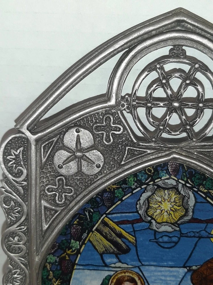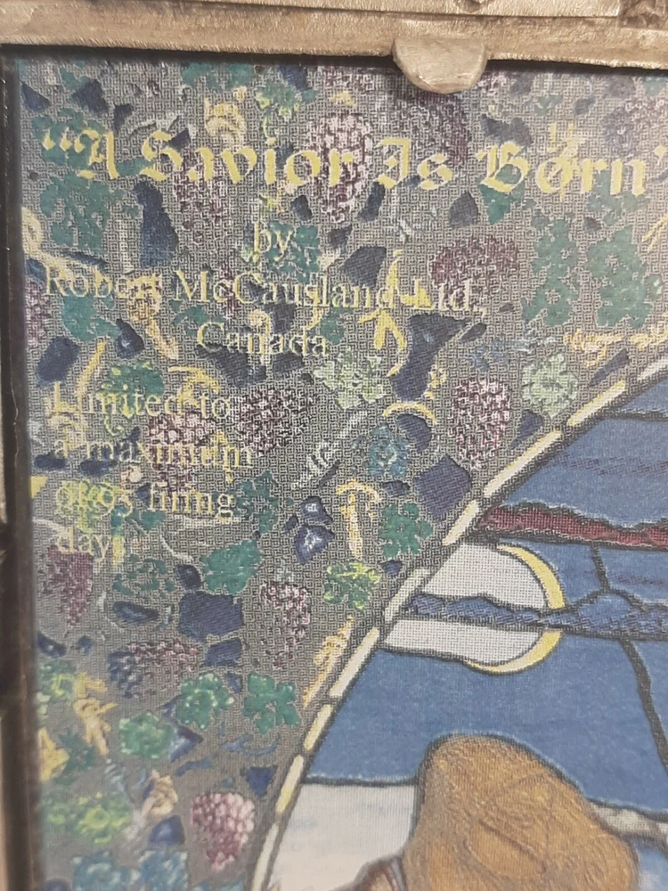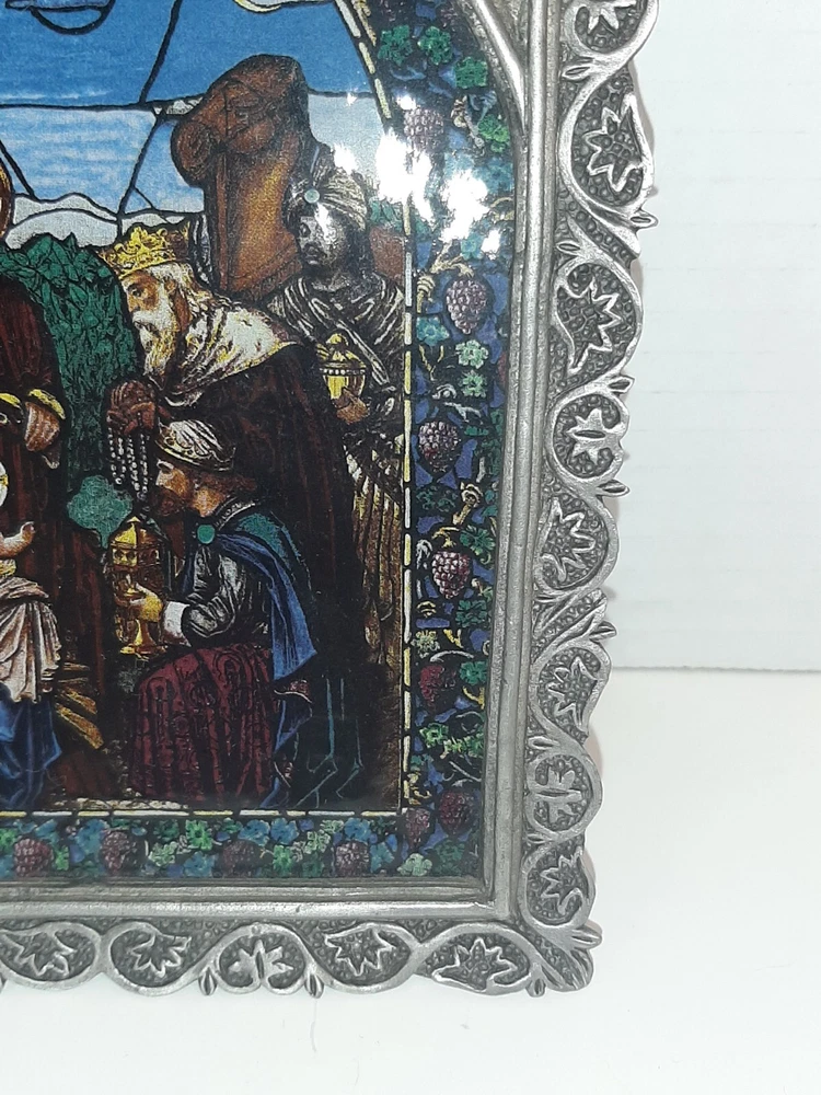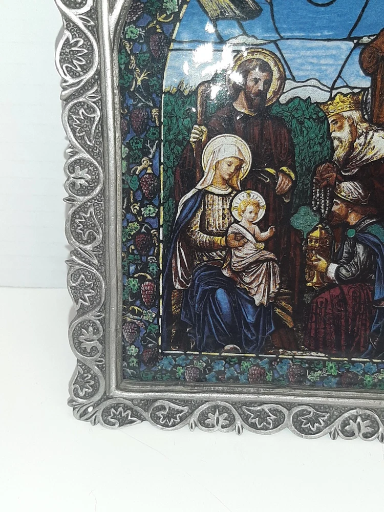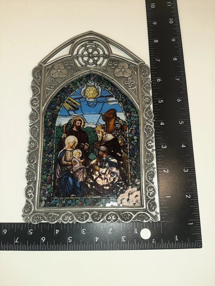 Divine Light The Bradford Exchange 1995 A Savior is Born Stain Glass Pewter READ In good pre-owned condition may show signs of wear from use/handling/storage/display. Please view all pics for condition/details/flaws/issues. SOLD AS IS There was supposed to be a chain off the back for hanging it is missing and broken off there is discoloration, surface scratches, dirt/debris to item. There is/maybe marks/spots/dirt/debris please see photos 1-14, there is/maybe paint loss/sticker loss please see photos 1-14, there is lite discoloration please see photos 1-14, there are surface scratches to item please see photos 1-14, please see all photos for condition/issues/details. I