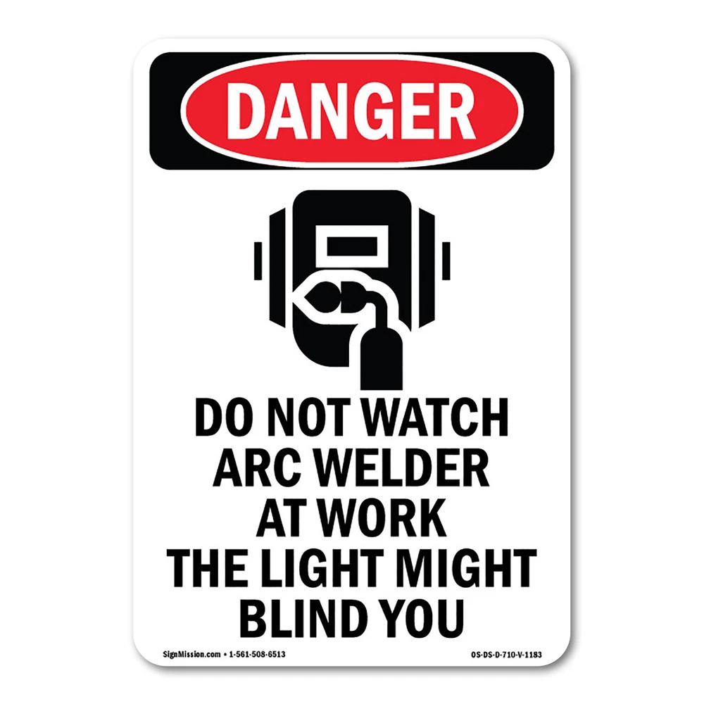 Universal 2 eBay Template by Finest Design Vinyl Banners Aluminum Signs Safety Signs Yard Signs Designer Aluminum Signs Novelty Signs Vinyl Banners Aluminum Signs Safety Signs Yard Signs Designer Aluminum Signs Novelty Signs Description Do Not Watch Arc Welder ANSI Danger Sign Metal Plastic Decal Make Sure You & Your Business are OSHA & ANSI Compliant. Is your business or work space 100% covered and up to code with current signage and labels? Never leave yourself exposed to lawsuits, fines, or reprimands - the integrity of your business and safety of others depends on it. Choose from Thousands of Signs. We have signs in all different shapes, sizes, and colors for almost every single business, workplace, manufacturing plant, production facility, or construction zone. Check out all our first aid signs, danger signs, keep door closed signs, electric panel hazard signs, storage signs, authorized personnel signs, lab chemicals signs and thousands more. Choose from: Aluminum, Rigid Plastic Signs or Adhesive Labels. Our signs are extremely durable yet flexible for even the most intense indoor or outdoor conditions. SignMission’s full color products are fabricated right here in the United States. Vinyl decals are equipped with super strong adhesive so that you can easily apply it to glass windows, aluminum, stainless steel, sanded wood, plexiglass and many more materials and sidings. Aluminum & rigid plastic signage materials are the perfect choice for mounting on walls, doors, fences, construction and caution areas. All of our materials surpass industry standards and will provide years of durability and longevity. 6 Month 100% Money Back Guarantee. Thousands of happy and satisfied businesses worldwide have turned to SignMission for all of their sign needs no matter what industry they’re in or what compliance needs they have. In the highly unlikely chance that you’re not 100% satisfied with your new sign or decal then simply send it back for a full refund or replacement within 6 months of the ship date. Go ahead order your OSHA Sign Today!