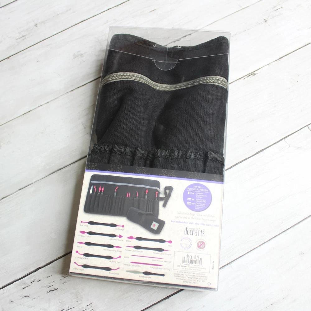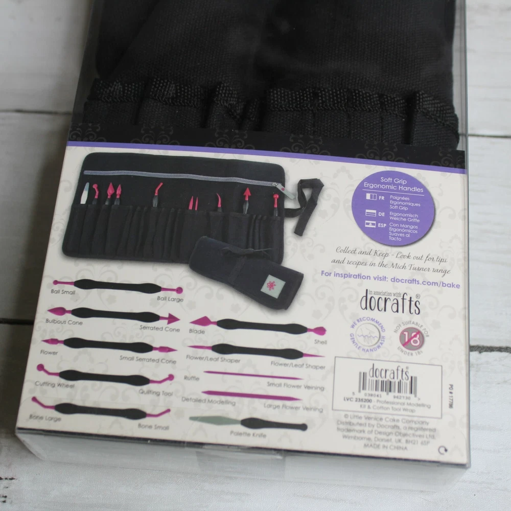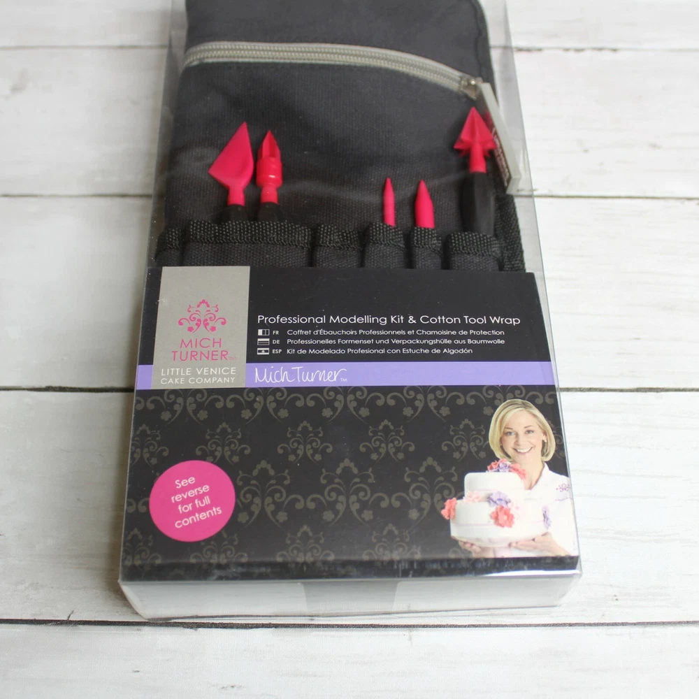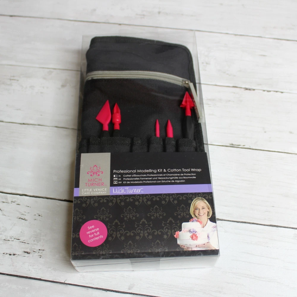 New in Package Mich Turner's Little Venice Cake Company DoCrafts Professional Modelling Kit & Cotton Tool Wrap Retail: $80.00 This Professional Modelling Kit & Cotton Tool Wrap includes 10 individual tools. The tools have soft grip ergonomic handles for ease of use. Use for cake decorating, fondant, clay and other craft projects. Mich Turner is one or the world's leading cake designers and Little Venice Cake Company has created cakes for celebrities and royalty including Her Majesty the Queen. I think you'll love the quality of this tool belt kit. It is brand new in the box. Kit Includes: -Black Pocket Apron Tool Belt Wrap -Ball Small/Ball Large -Bulbous Cone/Serrated Cone -Flower/Small Serrated Cone -Cutting Wheel/Quilting Tool -Bone Large/Bone Small -Blade/-Shell -Flower/Leaf Shaper -Ruffle/Small Flower Veining -Detailed Modelling/Large Flower Veining -Palette Knife