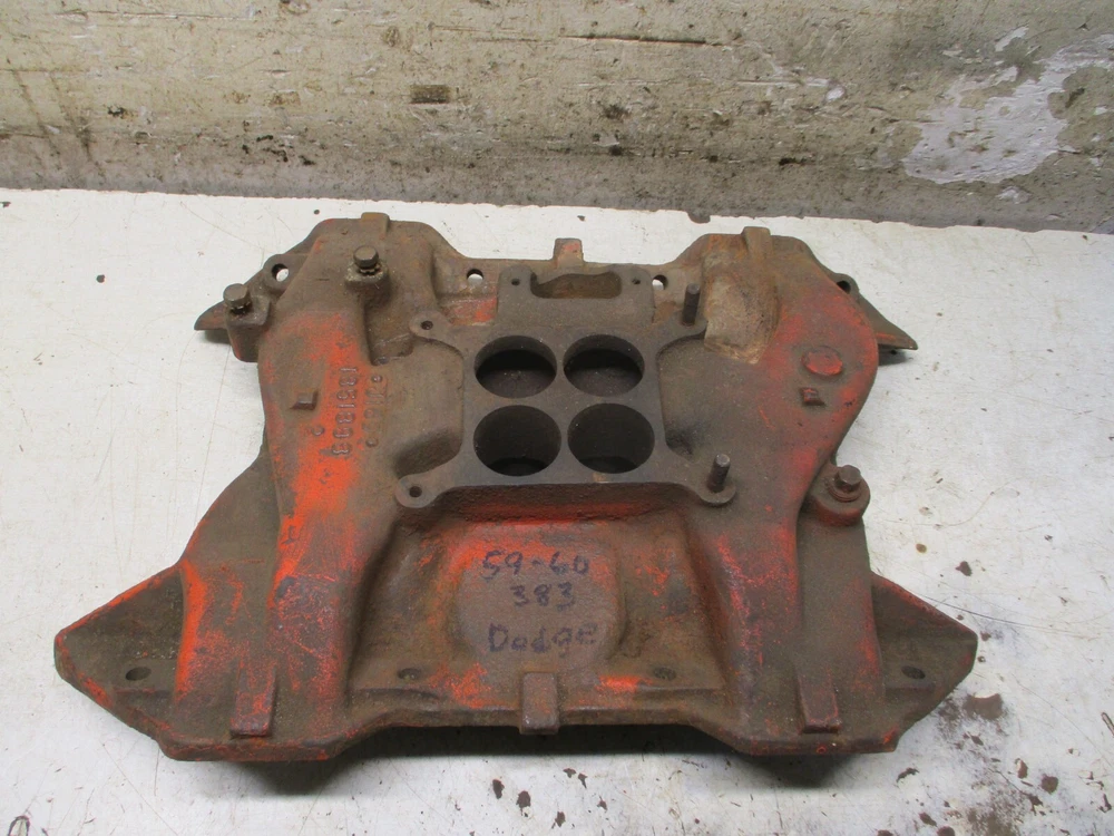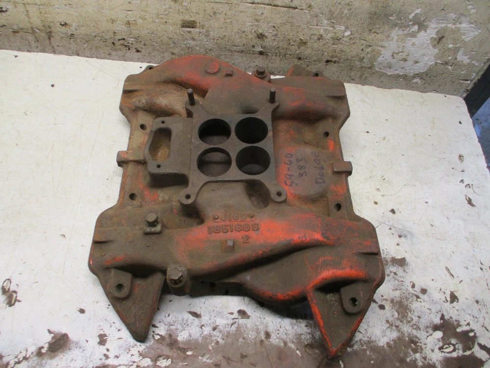 WELCOME TO MY SITE I HAVE BEEN PARTING OUT CARS AND COLLECTING PARTS FOR MANY YEARS WITH THE HOPES THAT ALL MY WORK AND EFFORT HELPS AS MANY PEOPLE AS POSSIBLE WITH THEIR RESTORATION PROJECTS. MOST OF MY PARTS UNLESS OTHERWISE STATED AS (NOS OR NEW) ARE USED AND IN "AS IS" CONDITION PLEASE BE SURE THE PART IS WHAT YOU'RE LOOKING FOR BEFORE PURCHASE. IF THERE IS ANY QUESTIONS ON THE PART, PLEASE FEEL FREE TO CONTACT ME AND I WILL ANSWER THEM TO THE BEST OF MY KNOWLEDGE. IF THERE IS ANY PROBLEMS WITH THE ITEM WHEN YOU RECEIVE IT, PLEASE BE SURE TO CONTACT ME ASAP I WILL DO WHATEVER IT TAKES TO MAKE SURE EVERYTHING IS CORRECTED RIGHT AWAY THANK YOU. This is an original MOPAR 383 4 bbl. cast iron intake manifold used on the 1959 Dodge Coronet, Royal, Custom Royal; 1960 Dodge Dart, Matador, Polara; 1960 Plymouth Belvedere, Fury and Savoy. Condition is used, nice original intake, no major rust pitting or cracks and no broken off bolts, will need to be cleaned and painted before install, casting number 1851898 . PAYMENTS MUST BE MADE WITH PAYPAL OR CREDIT CARD AS SOON AS PURCHASE IS COMPLETE. All my items will go out by USPS mail or Fed EX depending on size or weight within 24 hours of the purchase unless some unforeseen problem arises. Local pickups are always welcome! Please be sure to add bm455 to your favorites list and check out my E-bay store for more inventory of GM Chrysler and Ford parts at Buy It Now prices! Thanks so much for looking hope we can do business TODAY!!
